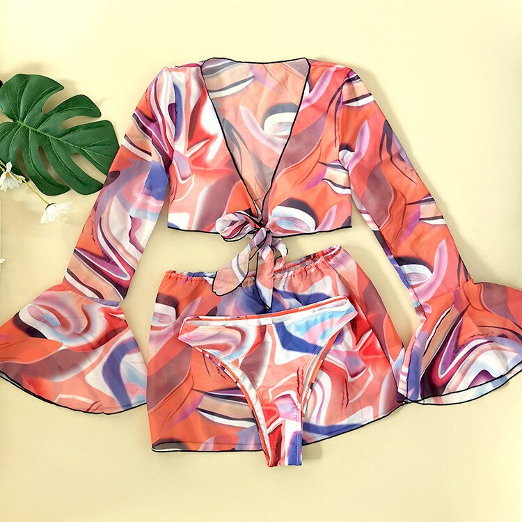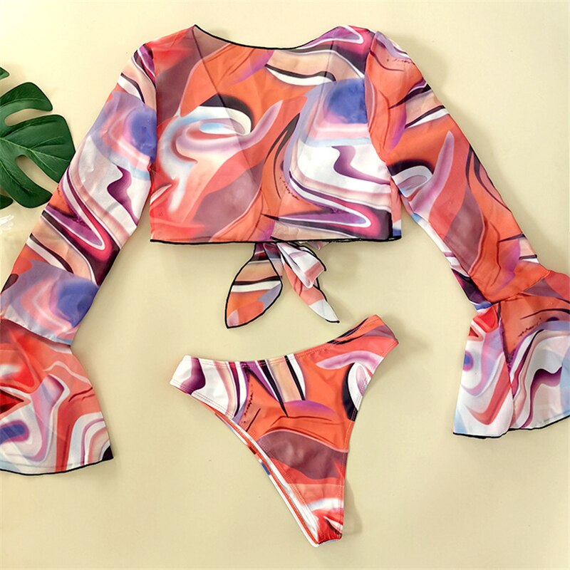 2022 جديد شبكة ثلاث قطع طويلة الأكمام البيكينيات مجموعة ملابس السباحة النسائية طباعة ملابس الصيف السباحة بحر الإناث لباس سباحة