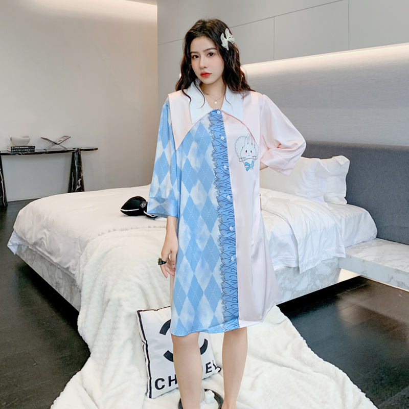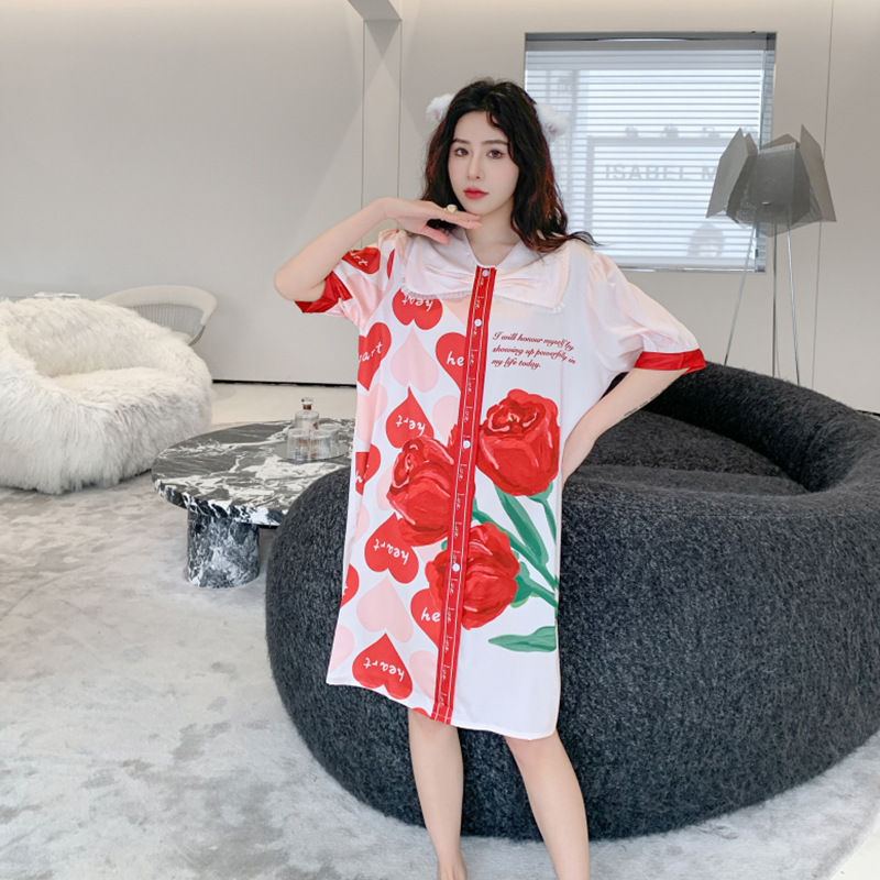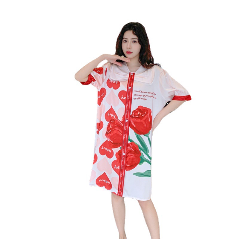 2023 ثوب نوم من الحرير الجليدي سترة نسائية ذات ياقة دمية مطبوعة رقمية من الحرير الجليدي مقاس كبير ثوب نوم بالجملة
