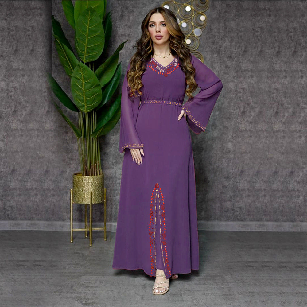 تم تزيين الياقة والأصفاد والتنورة والحزام بالماس الساخن، كما أن التنورة بها شقوق في الأمام والجوانب