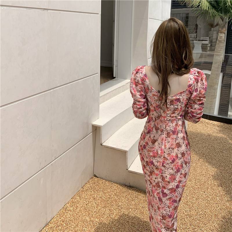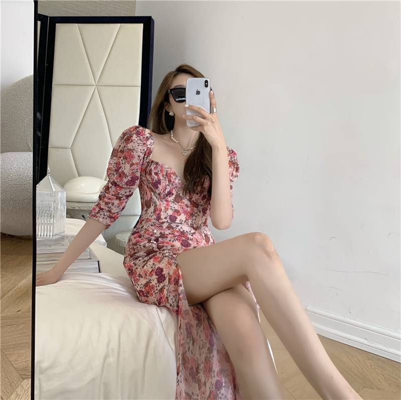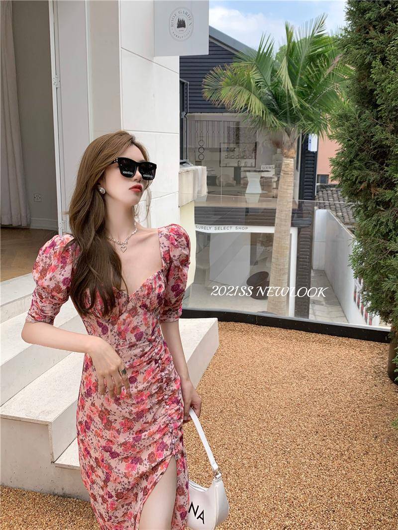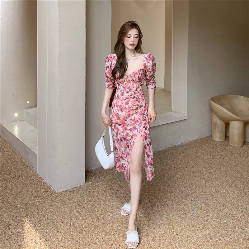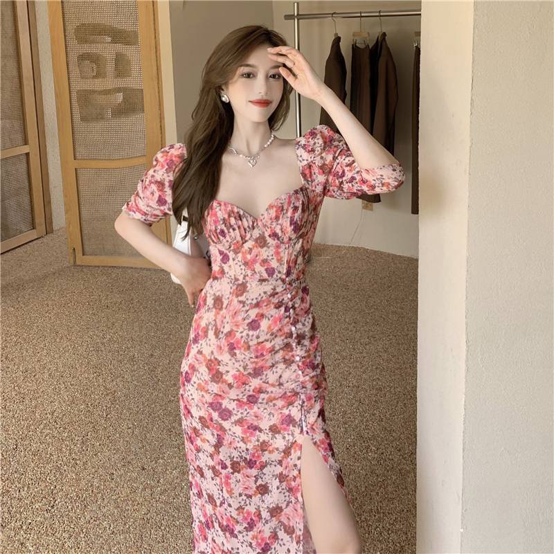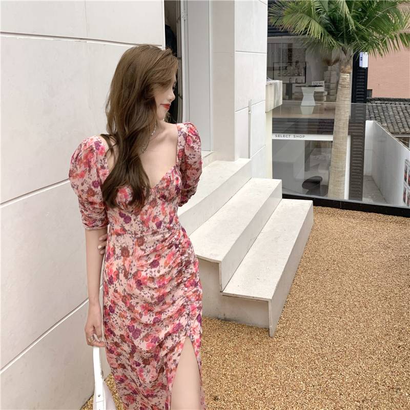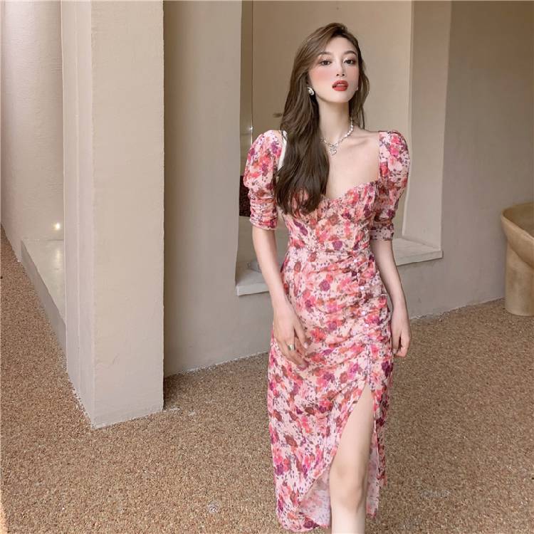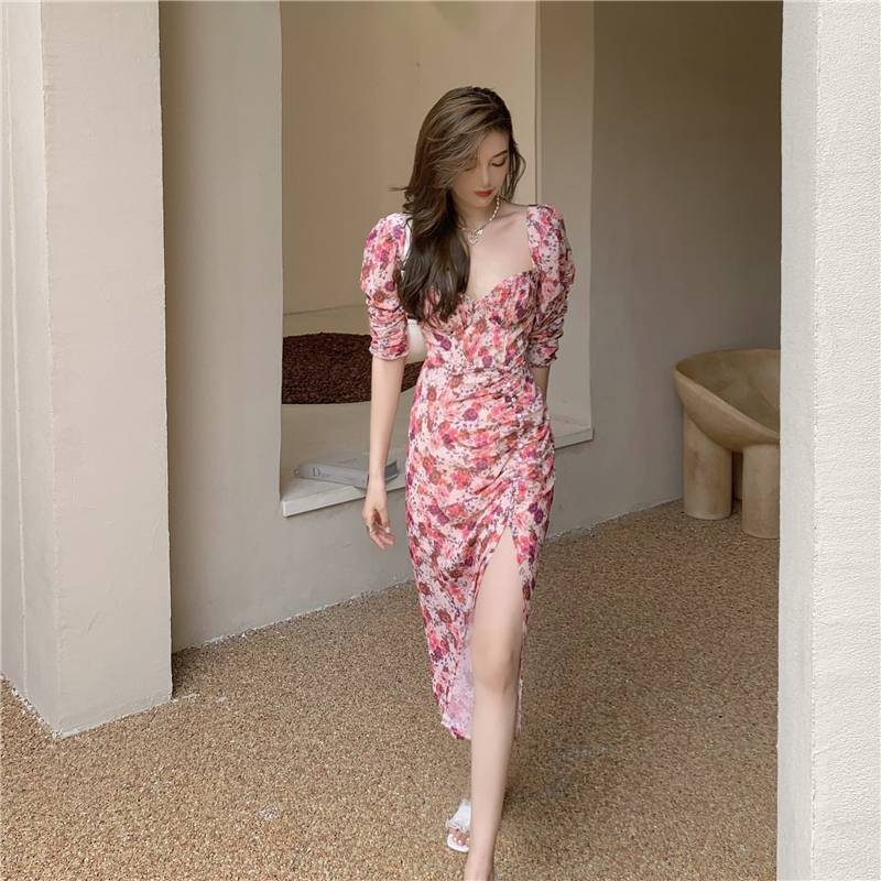 فستان للنساء 2021 فستان شيفون صيفي منقوش عليه زهور سبليت بوهو بيتش وردي فستان طويل مثير 3318 #