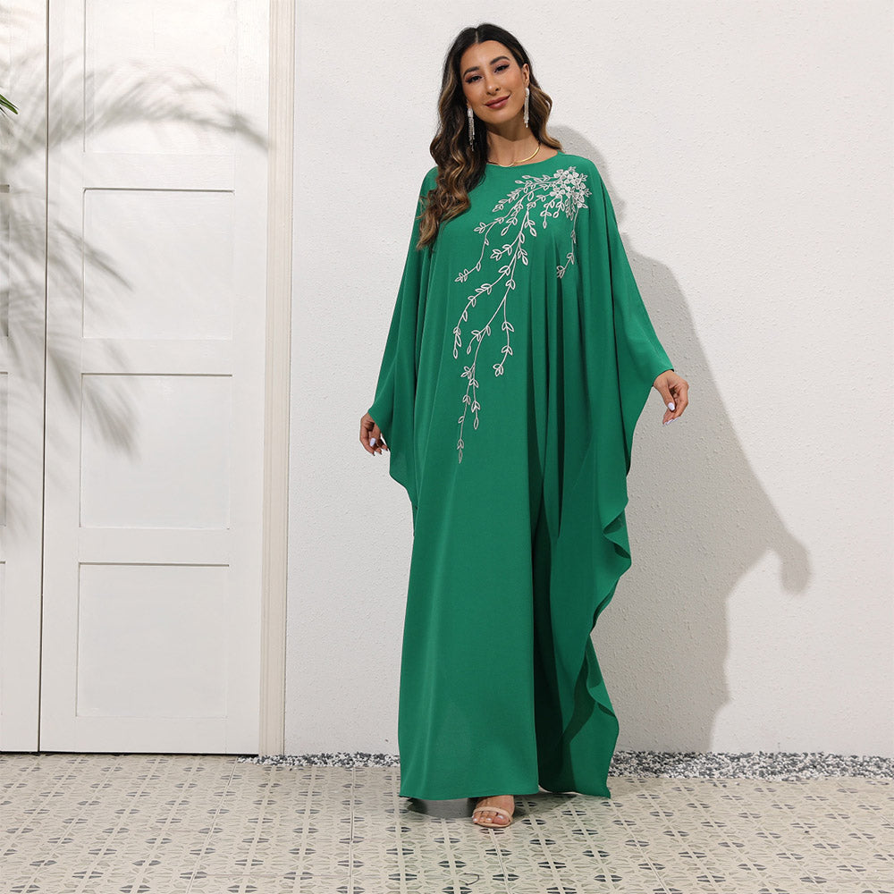 فستان أنيق من الشيفون بقصة فضفاضة مع أكمام مطرزة على شكل جناح الخفاش وياقة دائرية