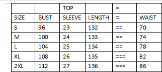 | حجم المنتج | الكتف (سم) | التمثال/الصدر (سم) | كم (سم) | طول التنورة (سم) | الخصر (سم) |