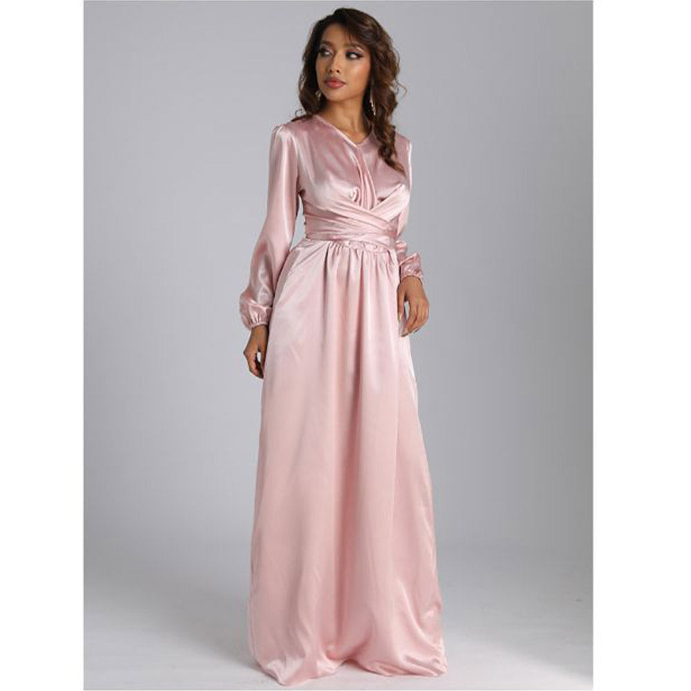 فستان عصري ونحيف برقبة على شكل حرف V مع ربطة خصر، ينضح بالأناقة
