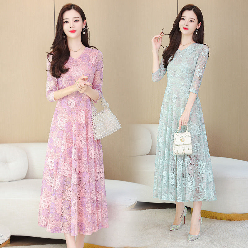حار بيع جديد الدانتيل فستان جاكار المرأة ربيع جديد مزاجه الخصر التخسيس الخامس الرقبة تنورة طويلة فستان المرأة
