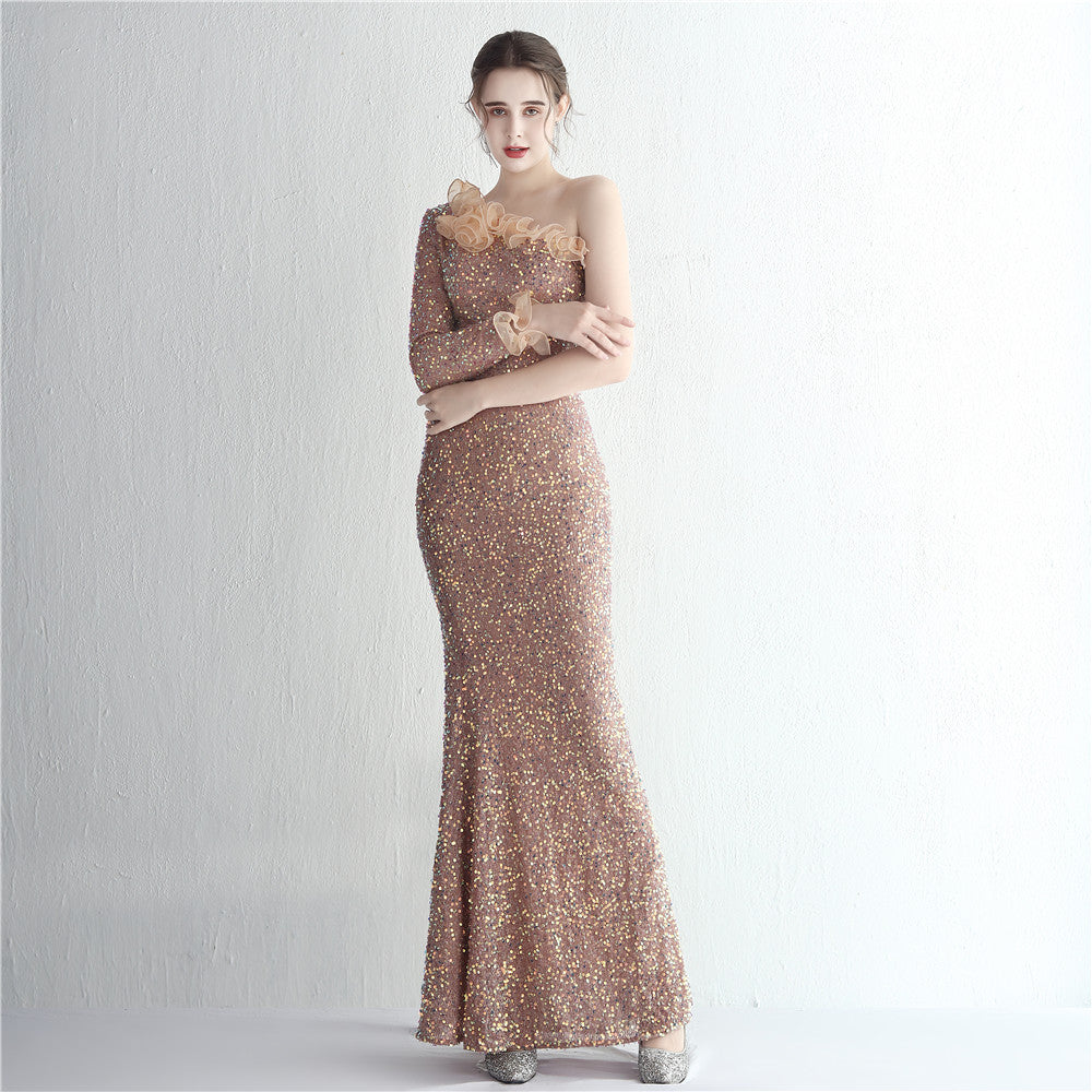 حار بيع اليدوية الترتر الغزل الحرفية السيدات مأدبة مزاجه كتف واحد طويلة الأكمام طويلة الترتر هالة الملكة ذيل السمكة