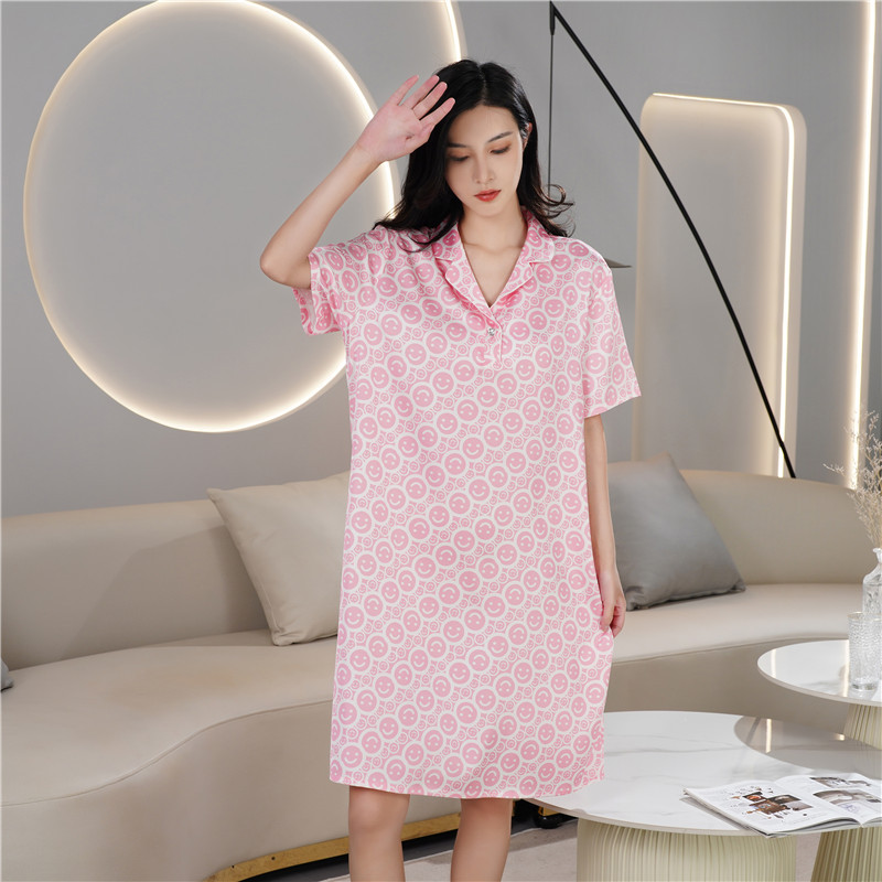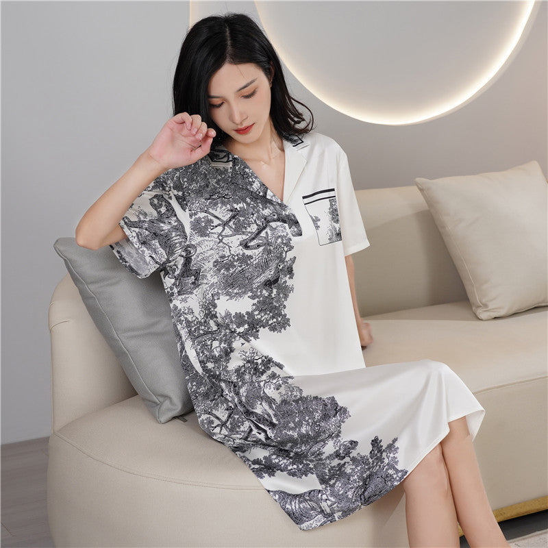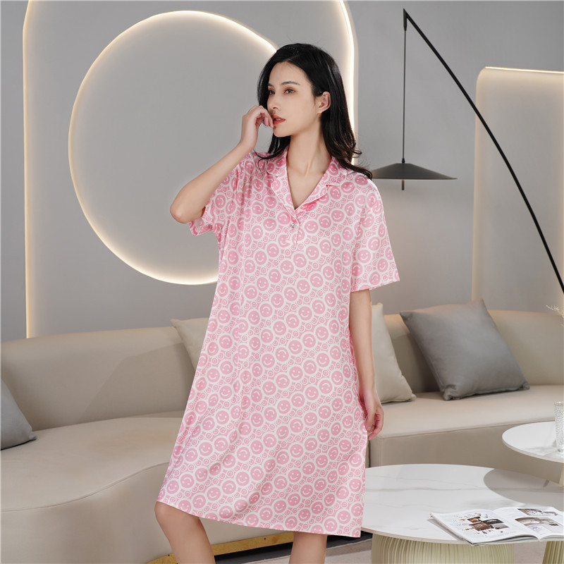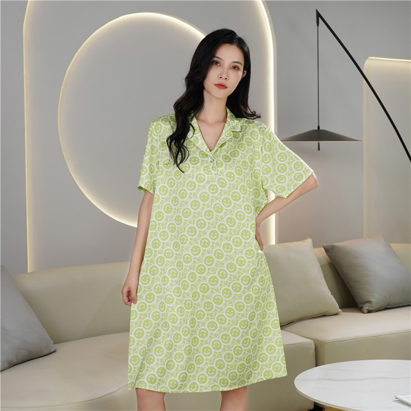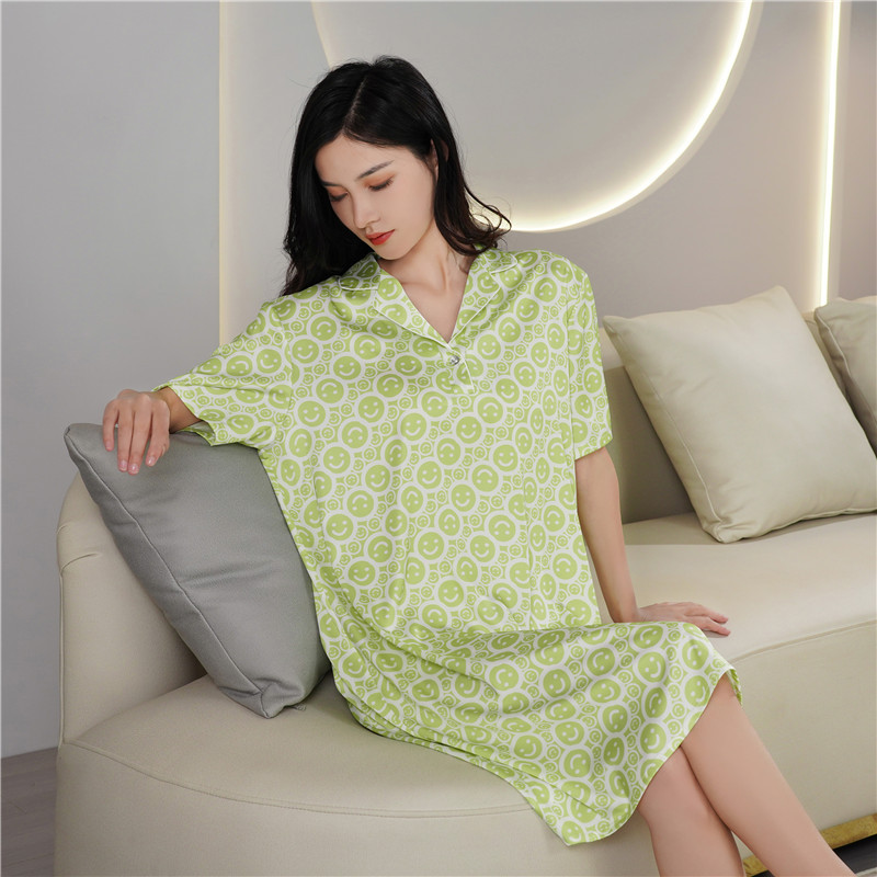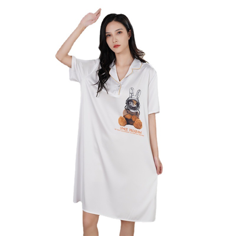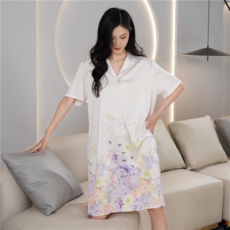 قميص نوم من الحرير الجليدي للسيدات ذو طية صدر السترة بأكمام قصيرة وتنورة قميص حريرية بطباعة شخصية غير رسمية تنورة قصيرة الأكمام للمنزل للبيع بالجملة