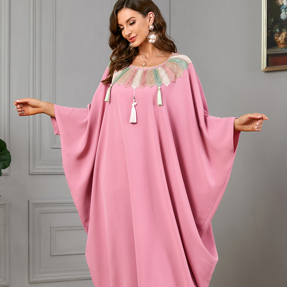 استمتعي براحة الجلابية المزينة بزخارف من الدانتيل، والتي تتميز بياقة مزينة بأهداب وأكمام مريحة على شكل جناح الخفاش.