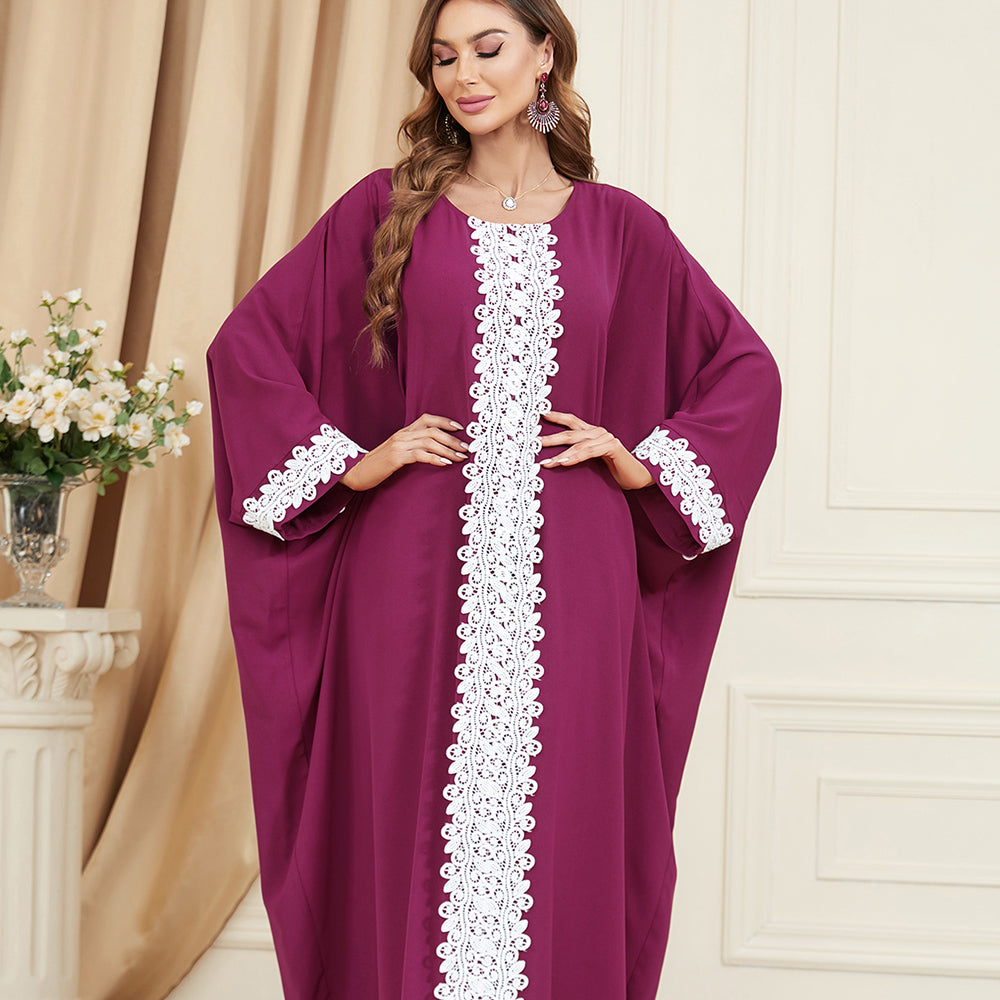استمتعي بالجاذبية المتلألئة للجلابية الحريرية، التي تنضح بحس فني | يتميز بأكمام فضفاضة على شكل جناح الخفاش، ورقعة جاكار معقدة