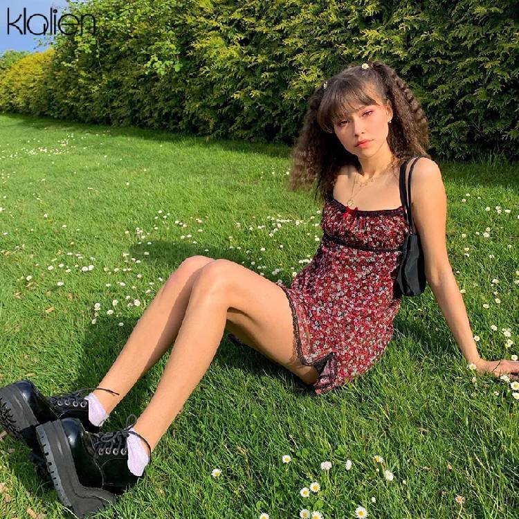 فستان قصير نسائي صيفي بوهو بحزام أحمر من KLALIEN فستان نسائي أنيق لطيف على طراز الكلية كاواي نحيف وناعم منقوش عليه زهور جديد