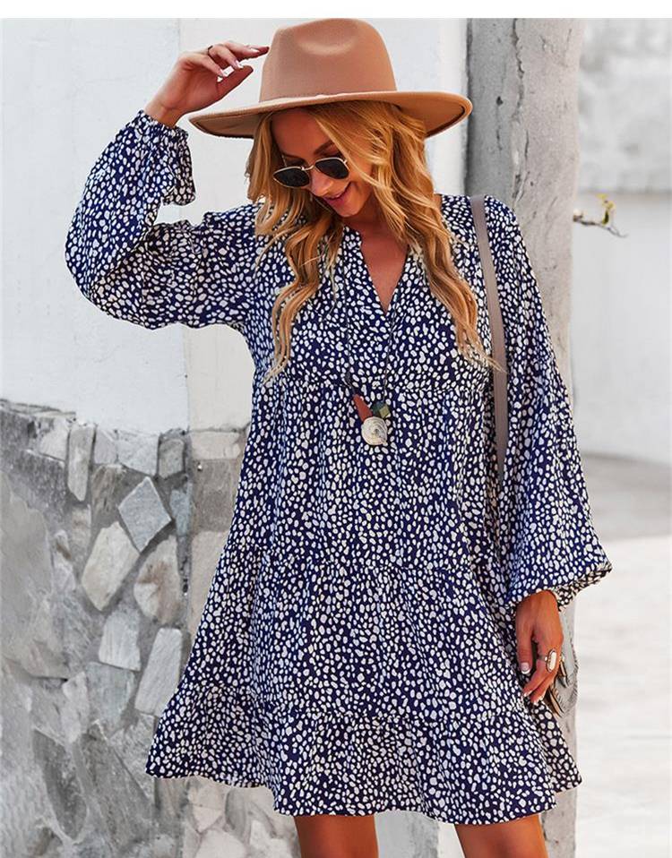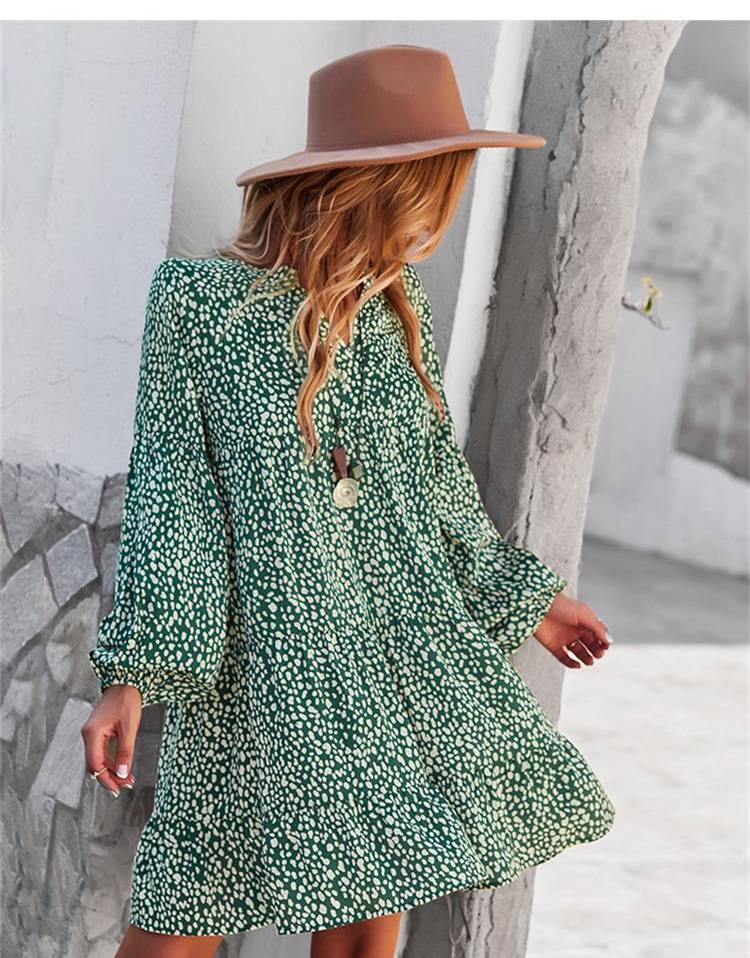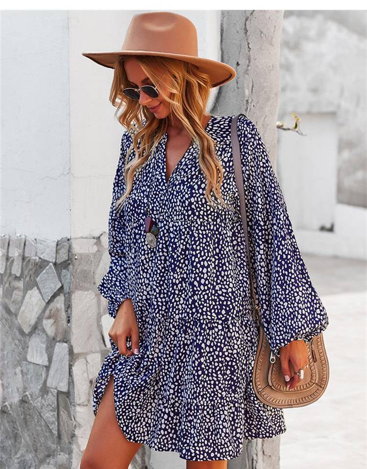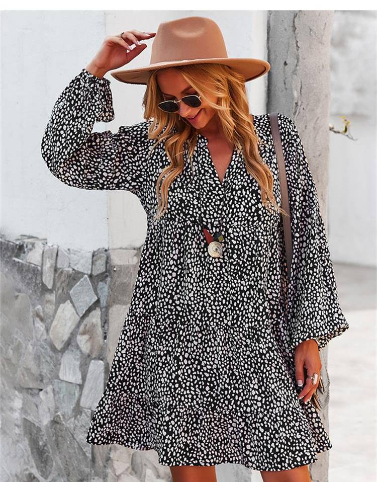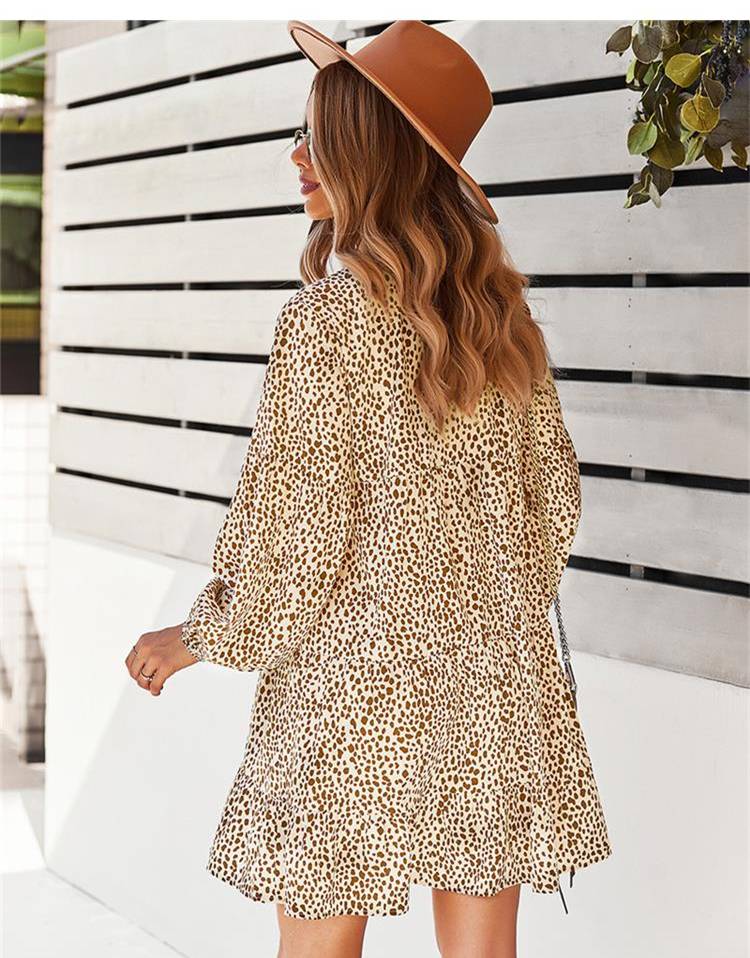 ليوبارد فستان زهري للنساء خريف كم طويل فستان كاجوال بوهو الخامس الرقبة فساتين حريمي فضفاضة نمط المهنة ملابس الشاطئ النسائية