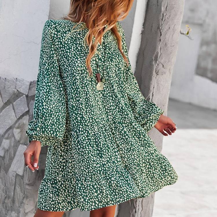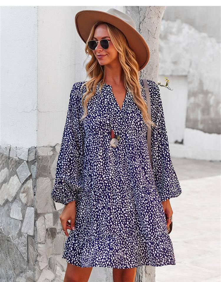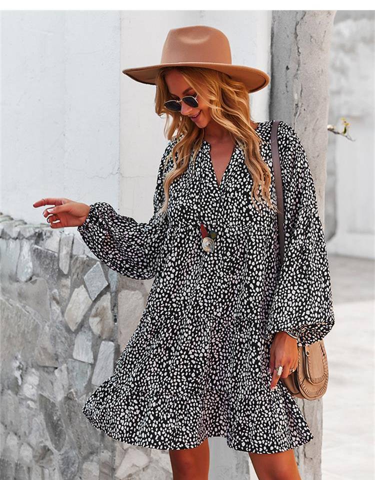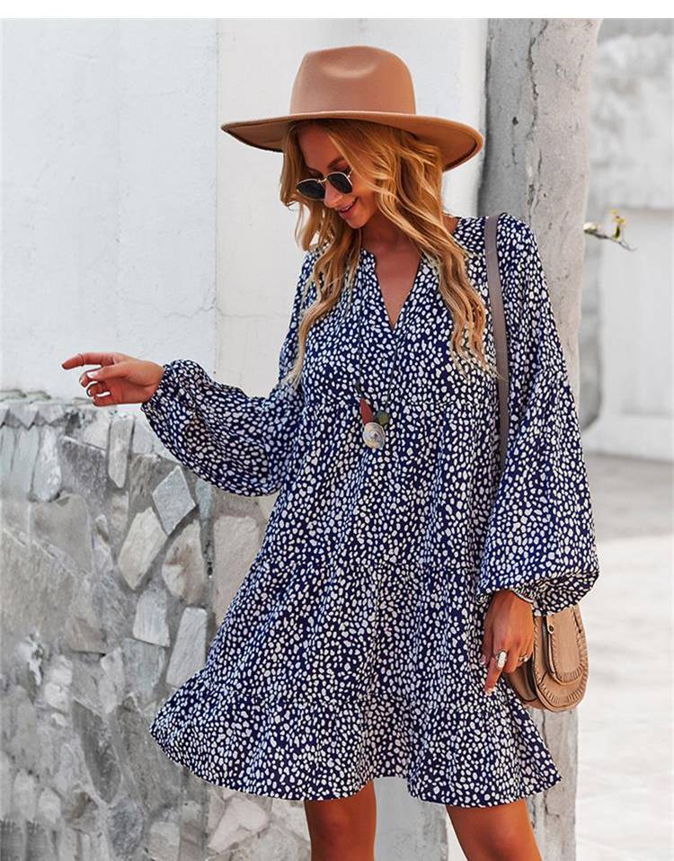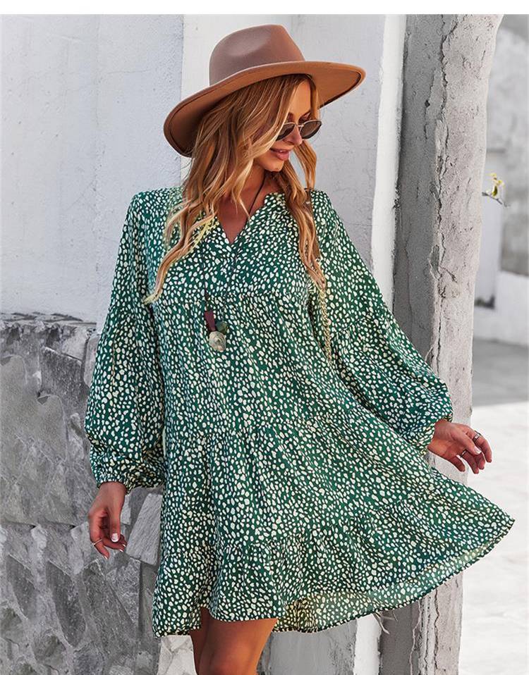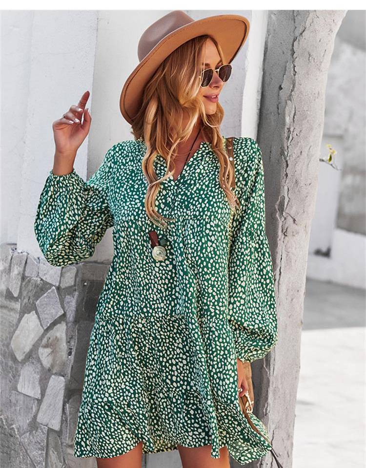 ليوبارد فستان زهري للنساء خريف كم طويل فستان كاجوال بوهو الخامس الرقبة فساتين حريمي فضفاضة نمط المهنة ملابس الشاطئ النسائية