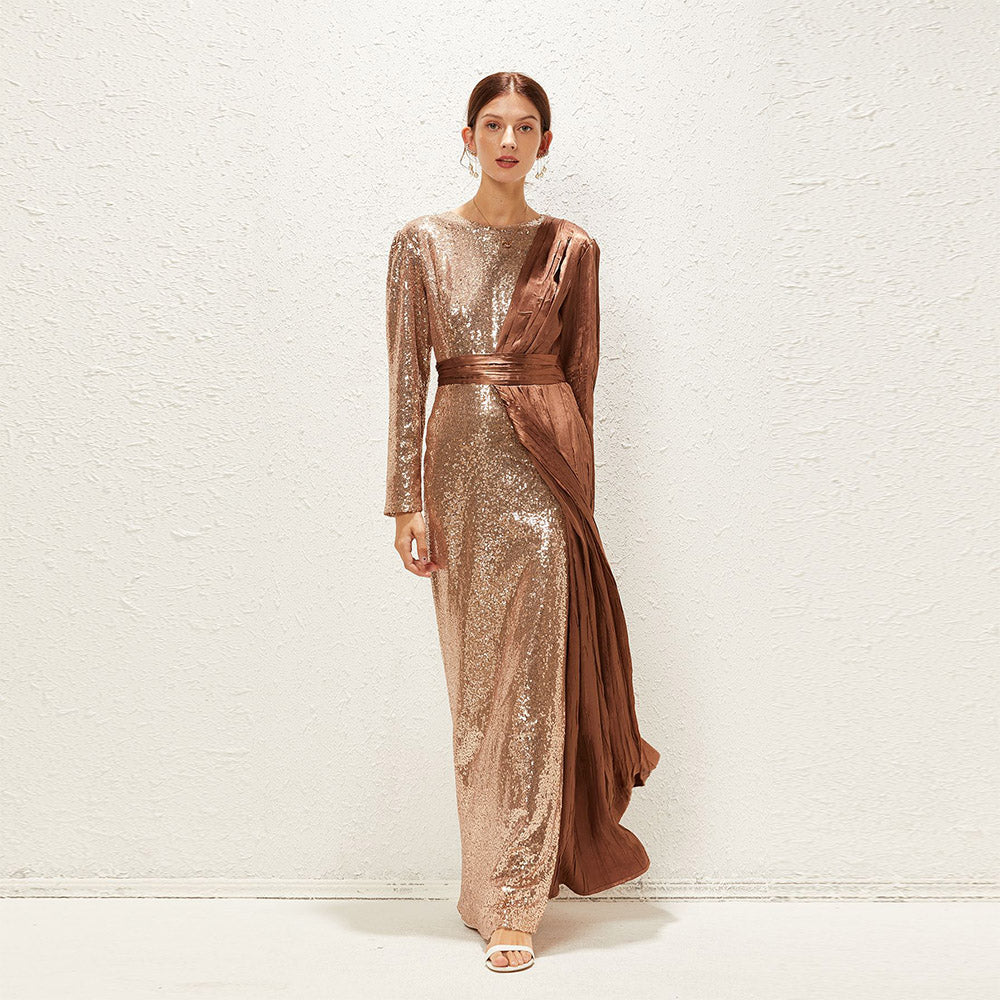 فستان نسائي أنيق من الموضة الإسلامية مع تطريز وترتر