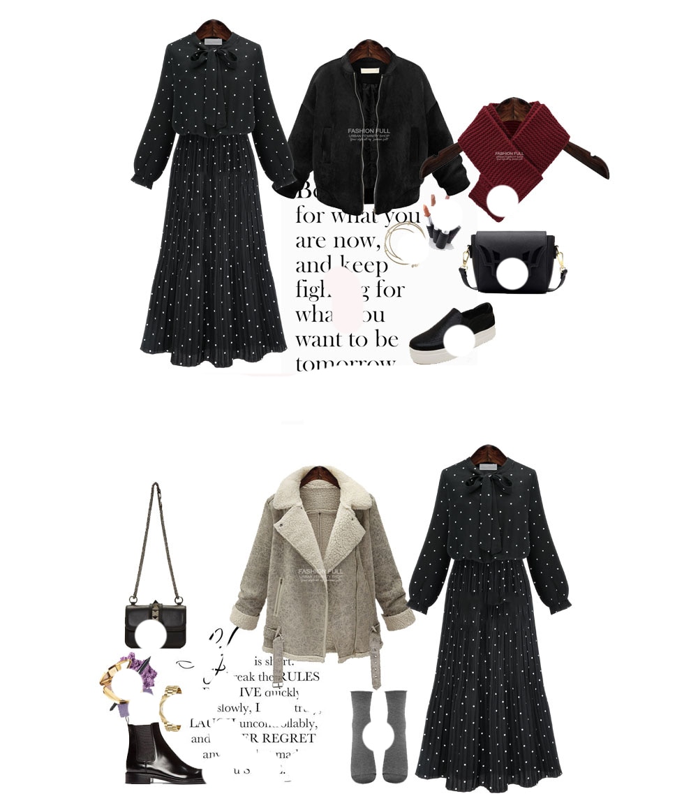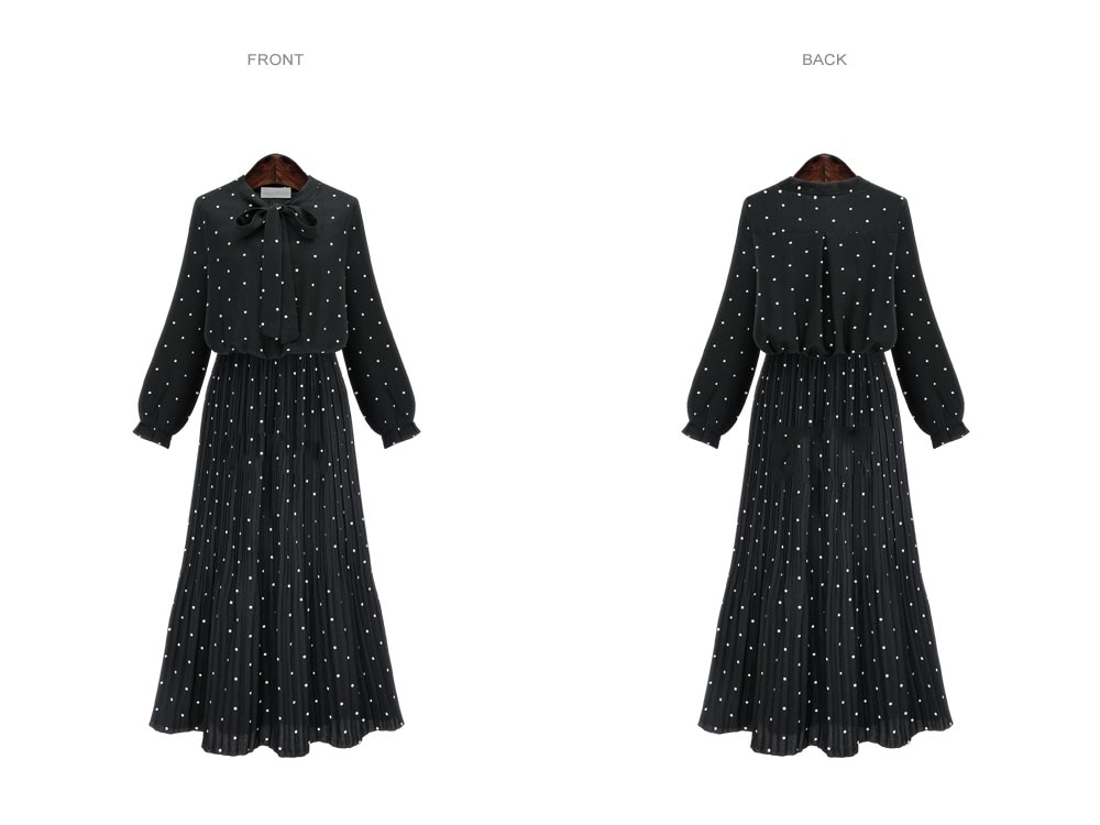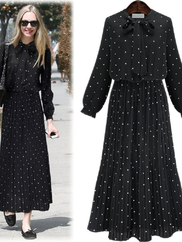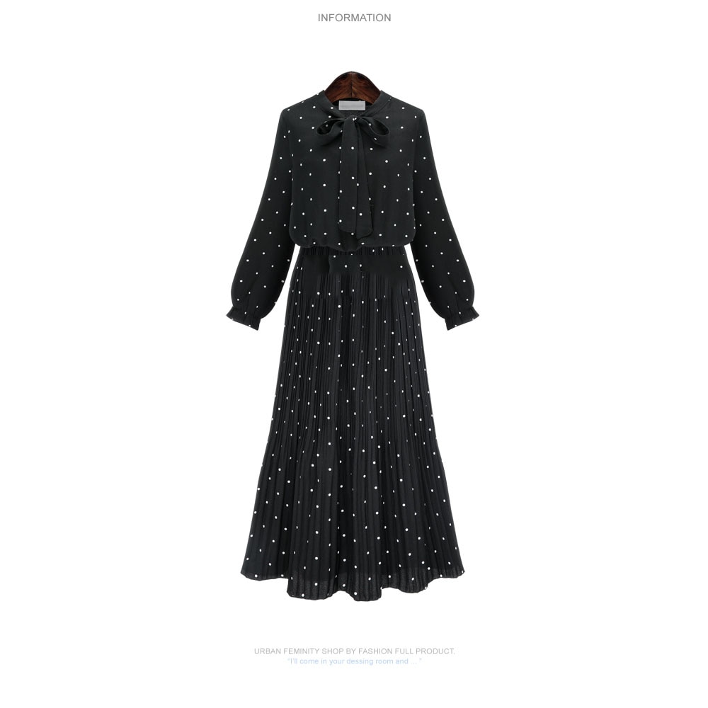 ربيع جديد فضفاض نمط النمط الأوروبي فستان منقط المرأة طباعة طويلة الأكمام السيدات فستان القوس البوهيمي الشيفون الشيفون فستان أسود المرأة رداء