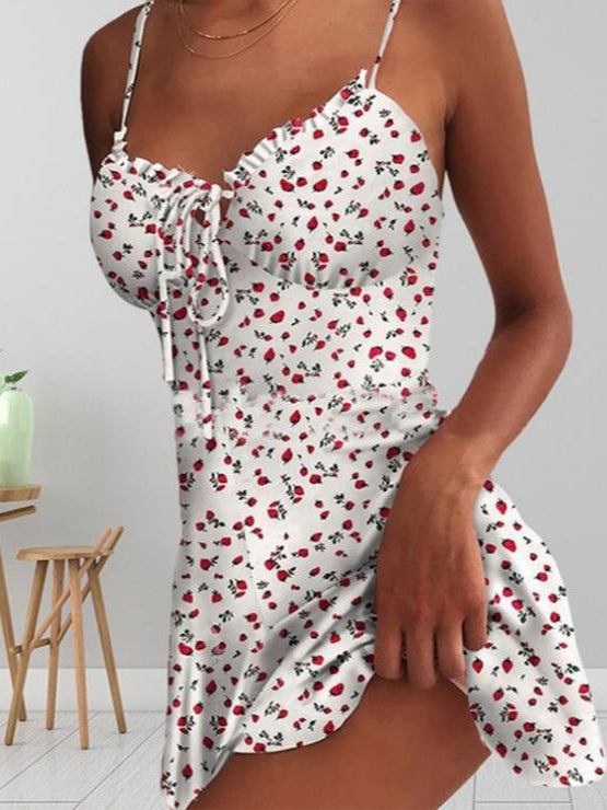 فستان قصير مكشكش مطبوع، فستان شاطئ بوهو، فستان شمس برباط