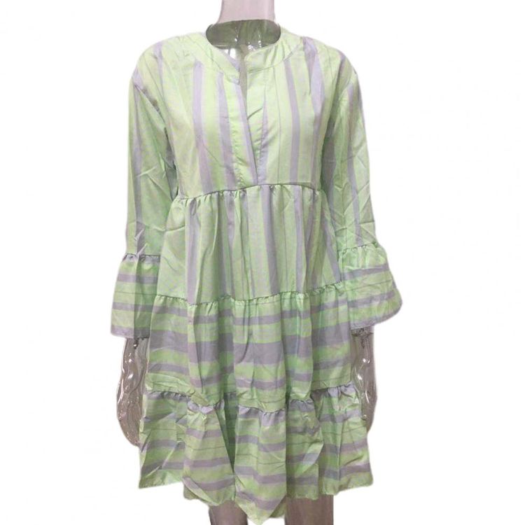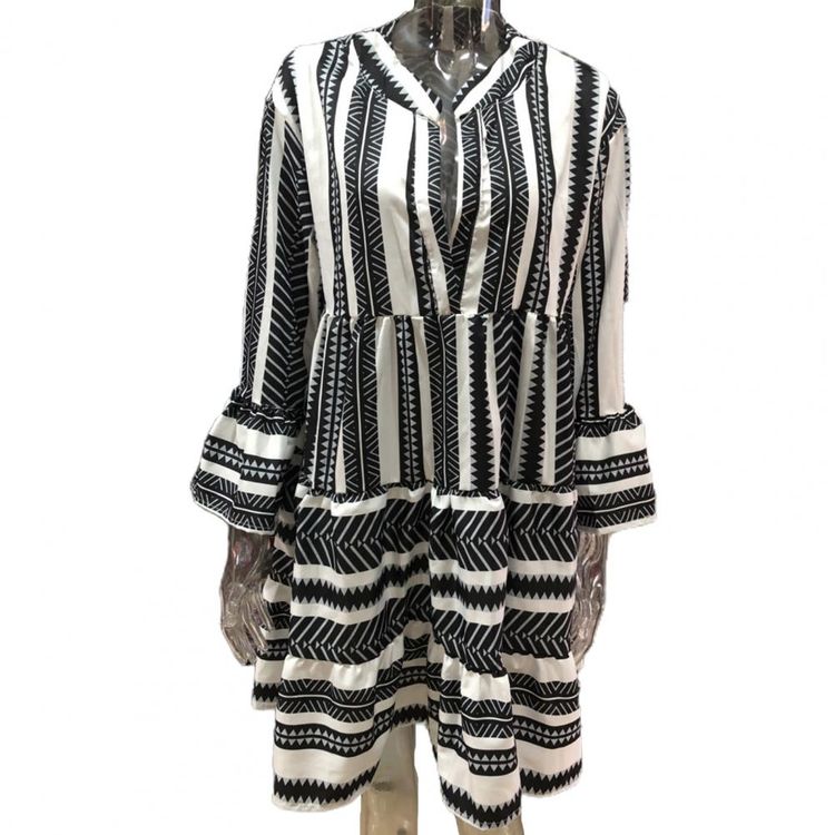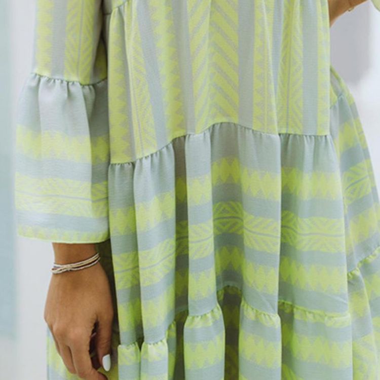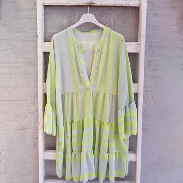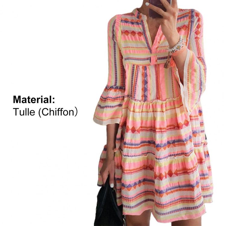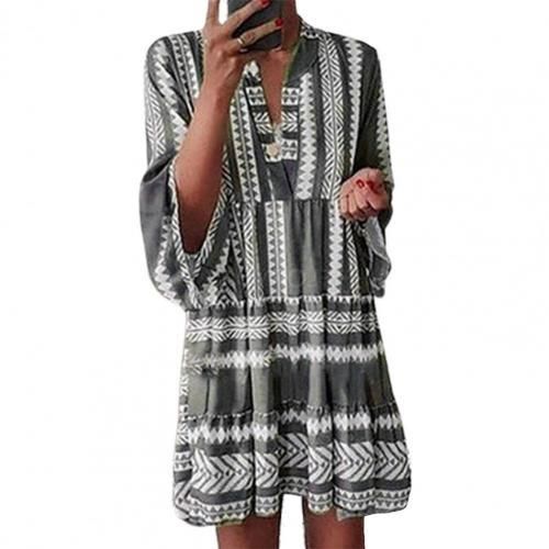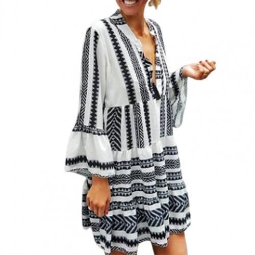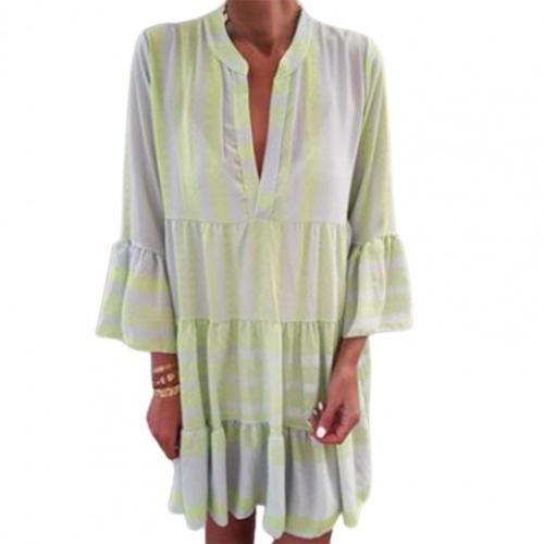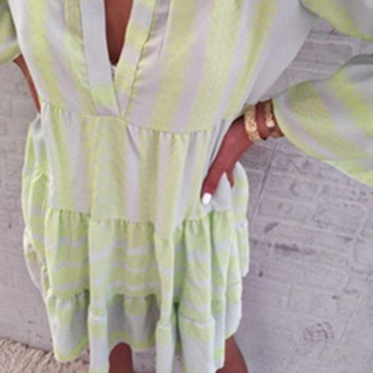 فستان قصير برقبة على شكل حرف V وأكمام ثلاثة أرباع وأكمام واسعة ومخطط فستان مكشكش كاجوال للحفلات