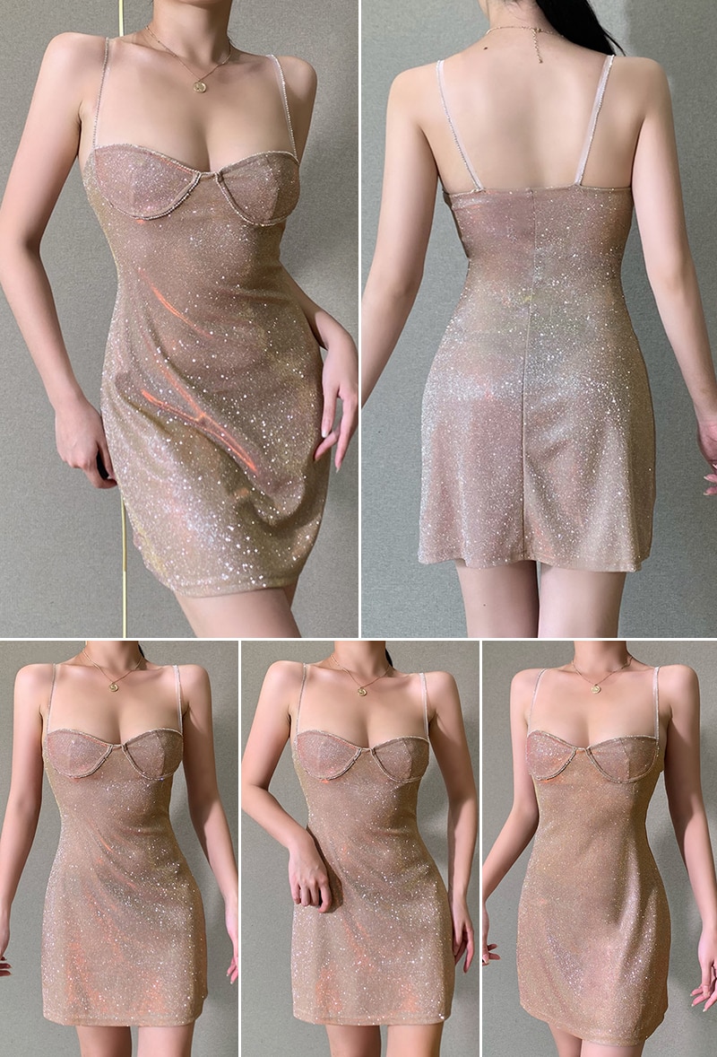 فستان قصير مثير للسيدات من الحرير اللامع والماس بدون أكمام وبدون ظهر وحفلات ملهى ليلي فستان أنيق جديد