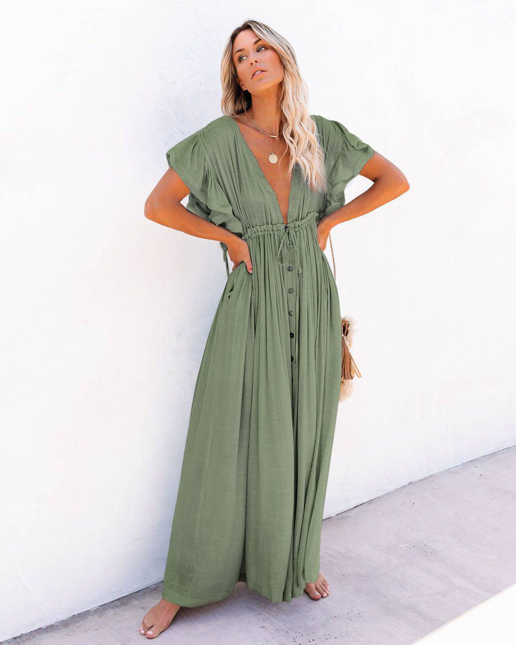 فستان ماكسي صيفي للشاطئ للنساء مطوي برباط عالي الخصر فستان طويل الصلبة بوهو عادية الخامس الرقبة فساتين الحفلات 2021