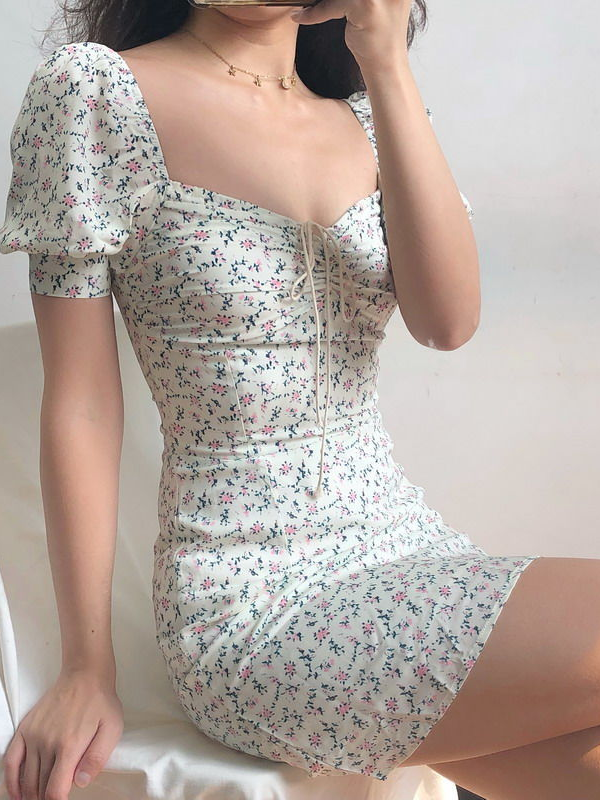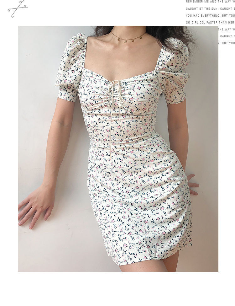 فساتين الصيف ريترو بوهو المرأة التعادل الرقبة الأزهار طباعة فستان أبيض قصير مثير أنيق نفخة الأكمام فستان الشمس الكورية