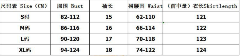 | حجم المنتج | الكتف (سم) | التمثال/الصدر (سم) | كم (سم) | طول التنورة (سم) | الخصر (سم) |
