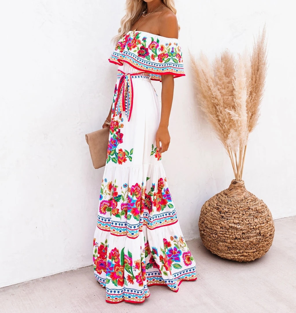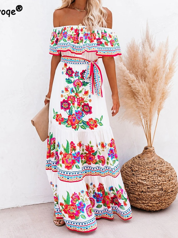 فساتين طويلة كلاسيكية مطبوعة صيفية للنساء فستان طويل مثير مكشوف الأكتاف مكشكش موضة بوهو للحفلات 2022 فستان صيفي للشاطئ للسيدات