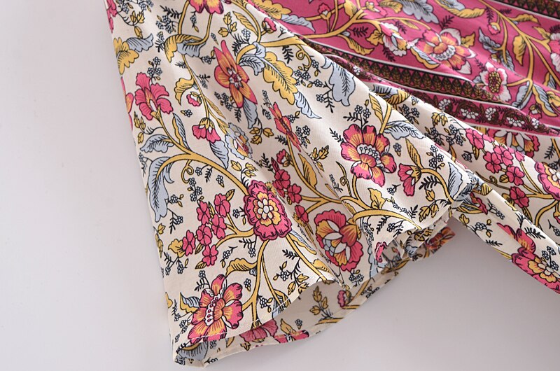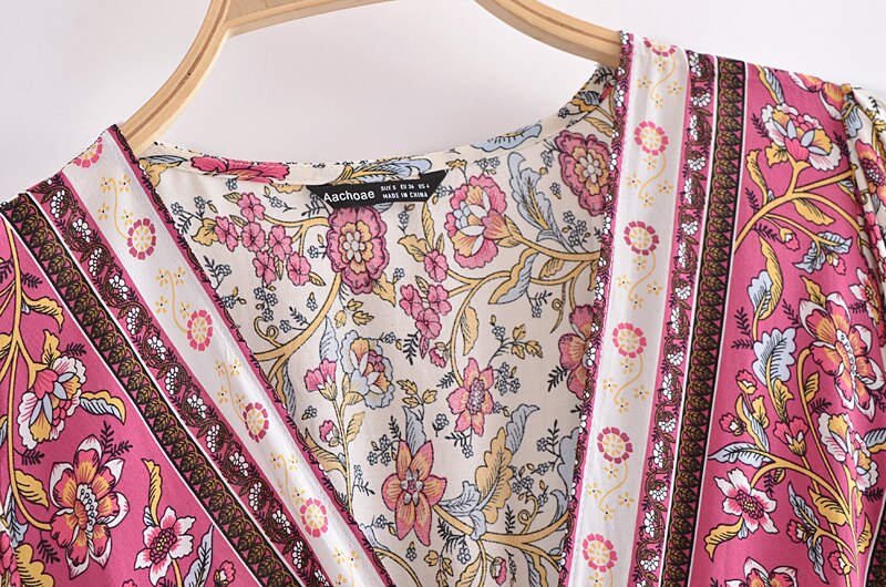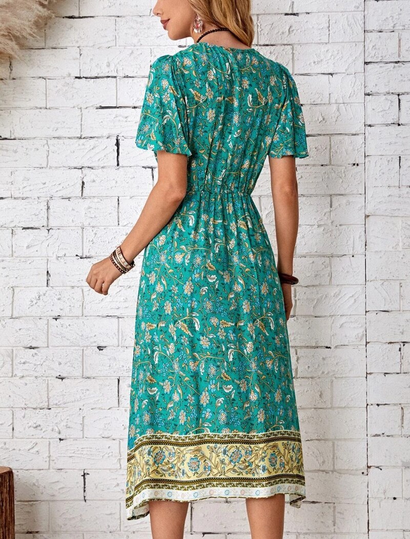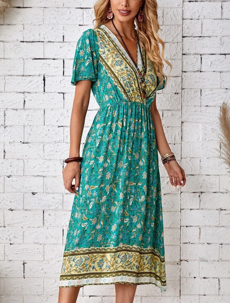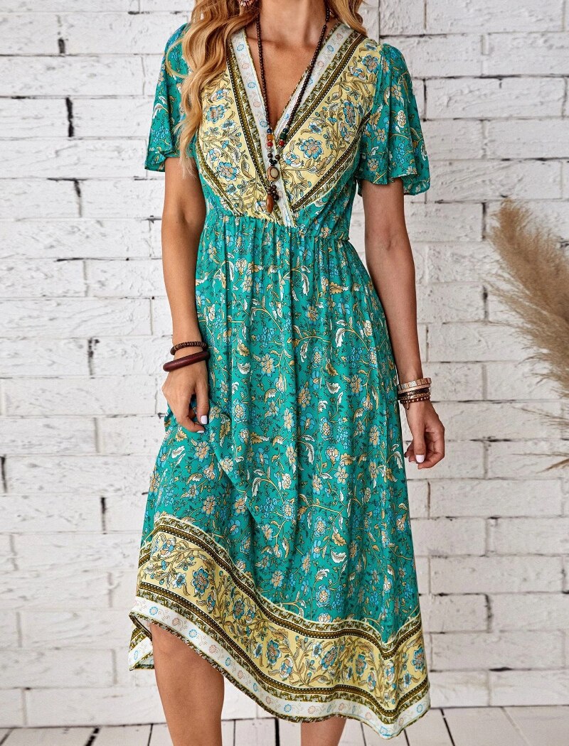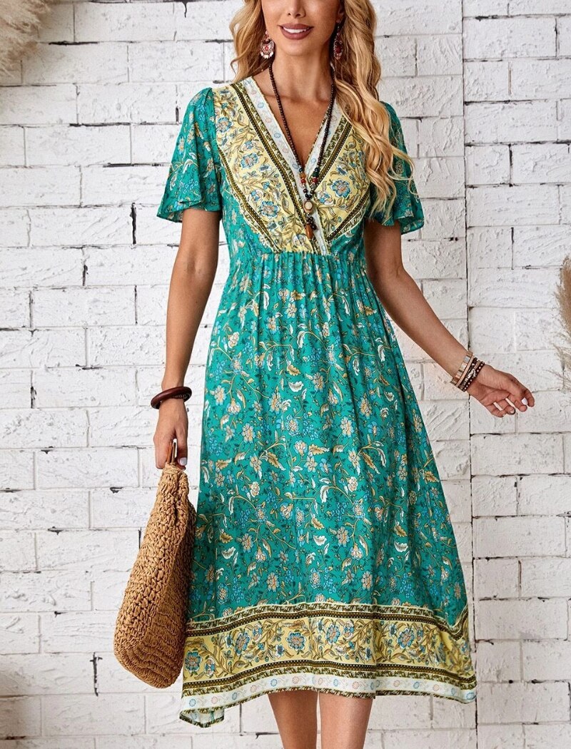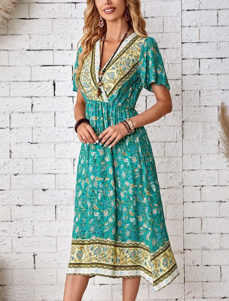 فستان صيفي نسائي بوهو مطبوع عليه زهور على شكل حرف A أنيق بياقة على شكل V وأكمام قصيرة على شكل فراشة فستان شاطئ كاجوال للسيدات