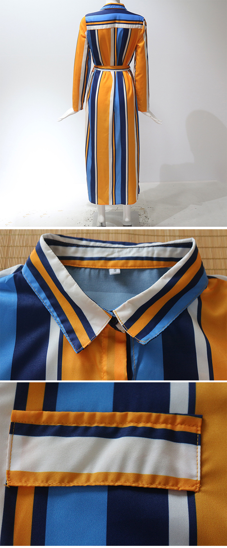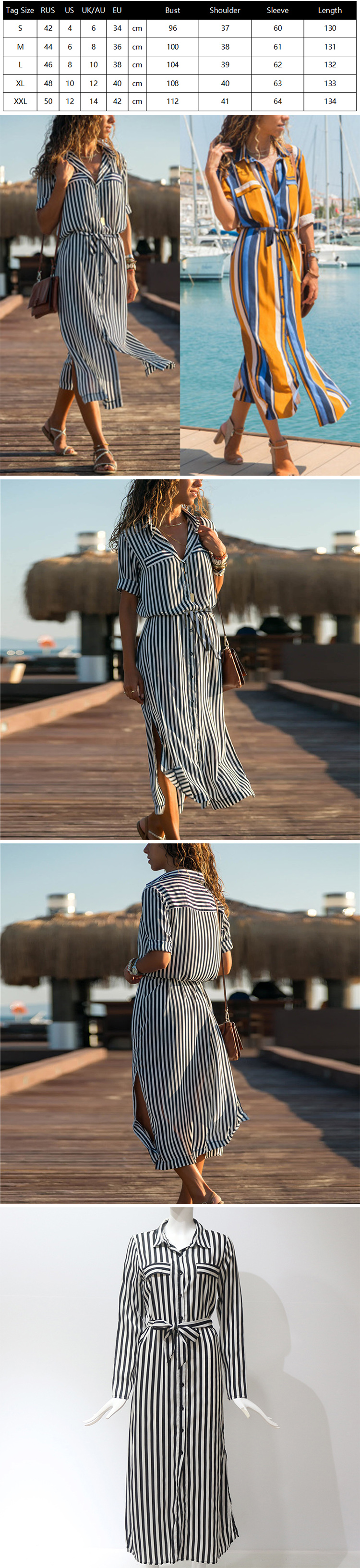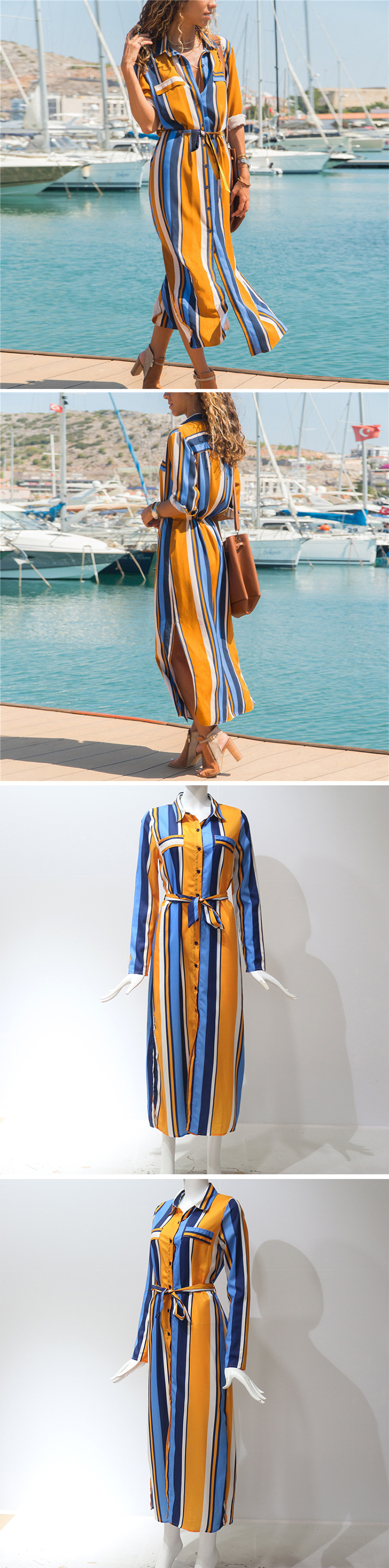 التصميم: فستان قميص طويل مطبوع عليه خطوط، تصميم حزام خصر، تنورة أنيقة بأزرار مع جيوب تجعلك أنيقة بين الناس.