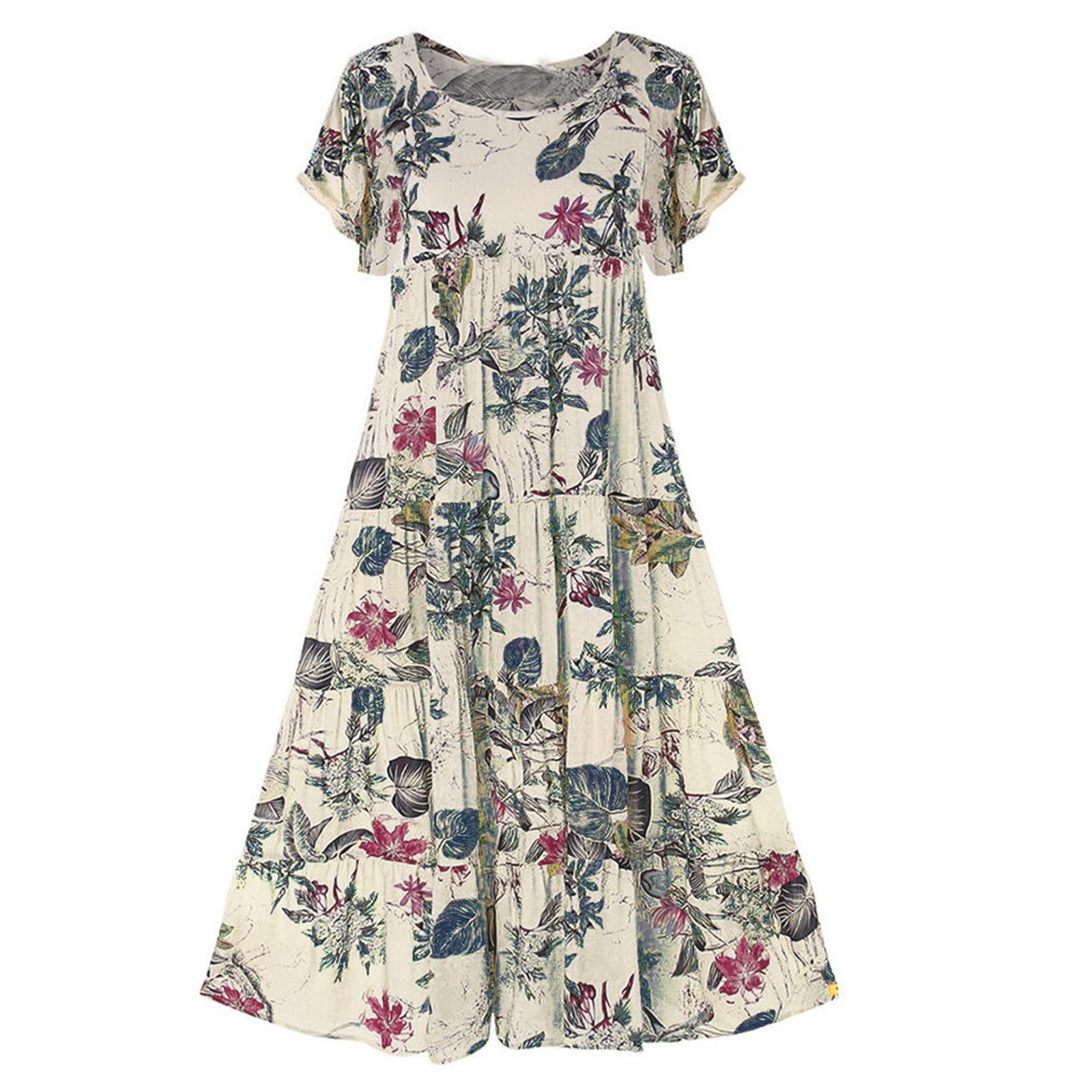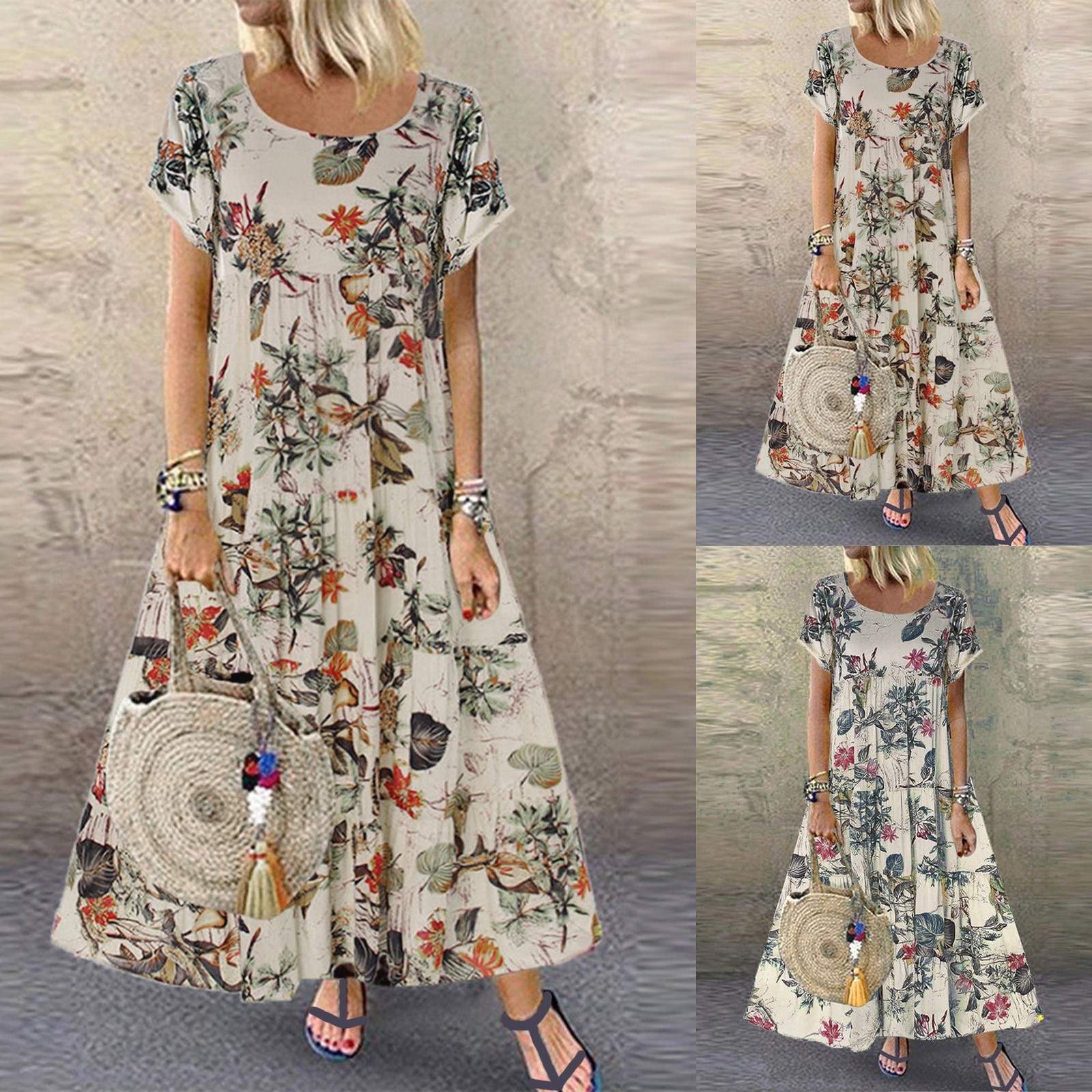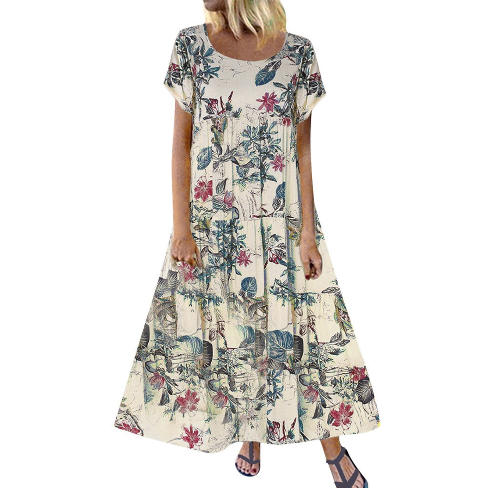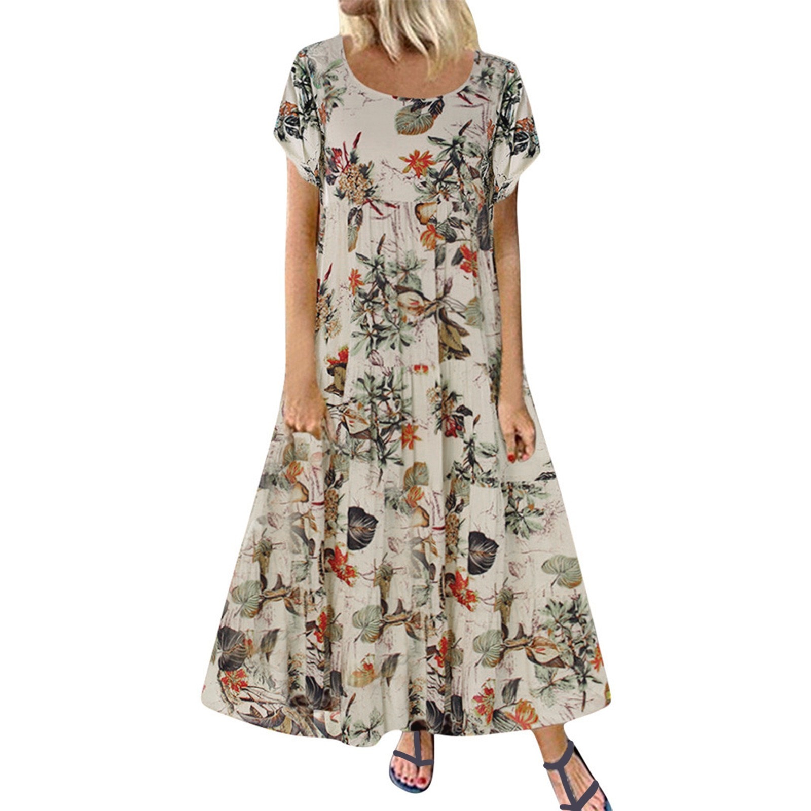 فستان طويل ماكسي نسائي كاجوال مطبوع عليه زهور بأكمام قصيرة من القطن والكتان