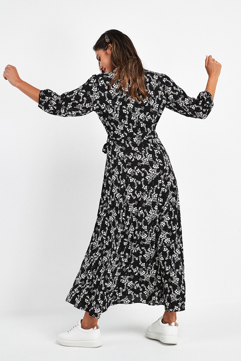 فستان ماكسي كلاسيكي بطبعة زهور للنساء بوهو بأكمام ثلاثة أرباع فستان طويل وشاحات وياقة مقلوبة فساتين غير رسمية رداء