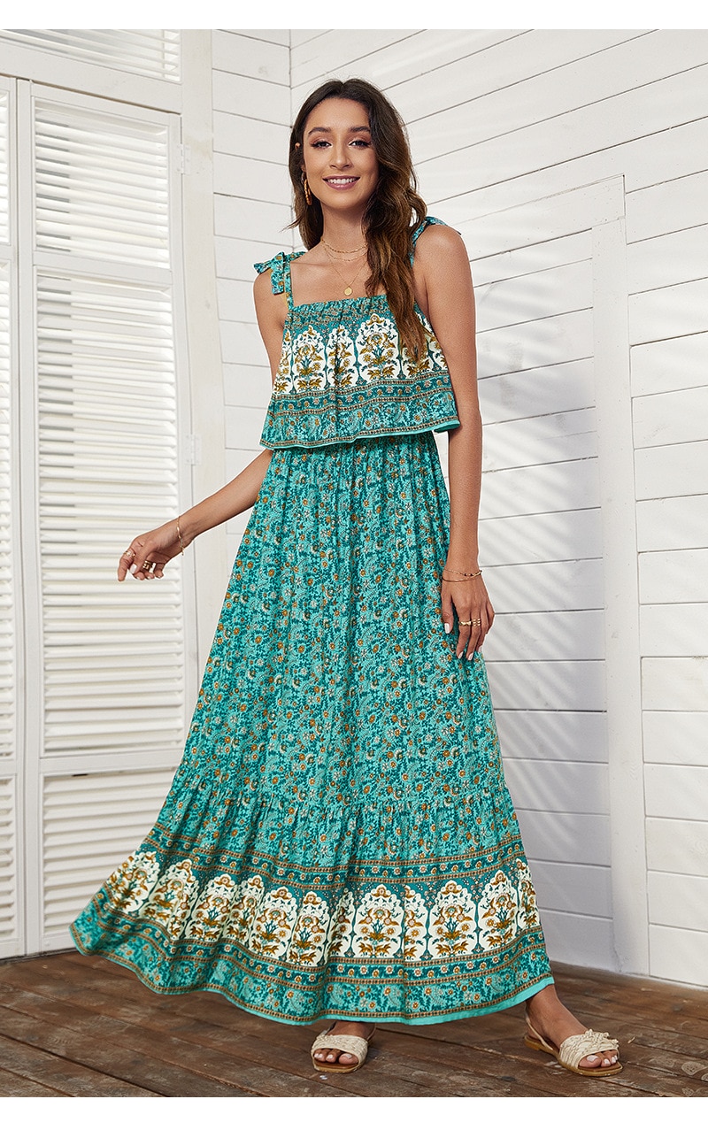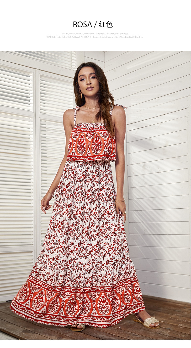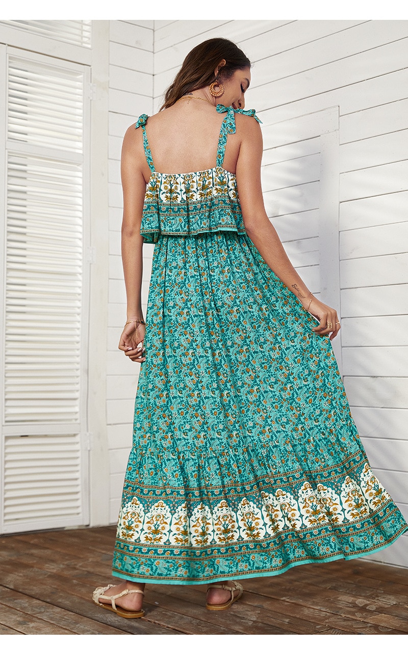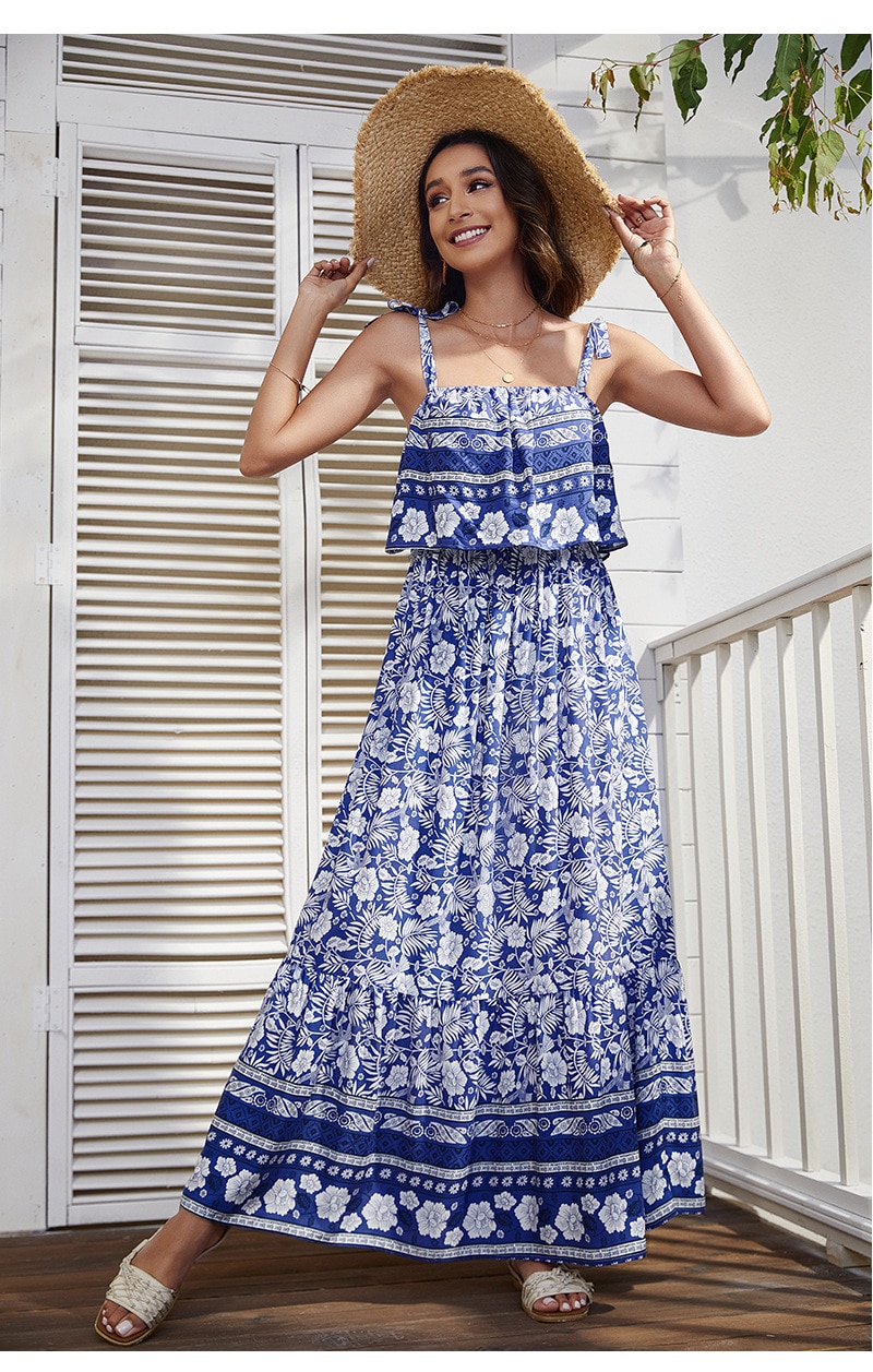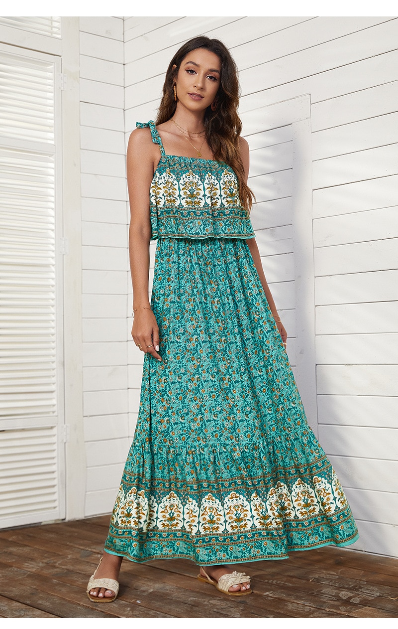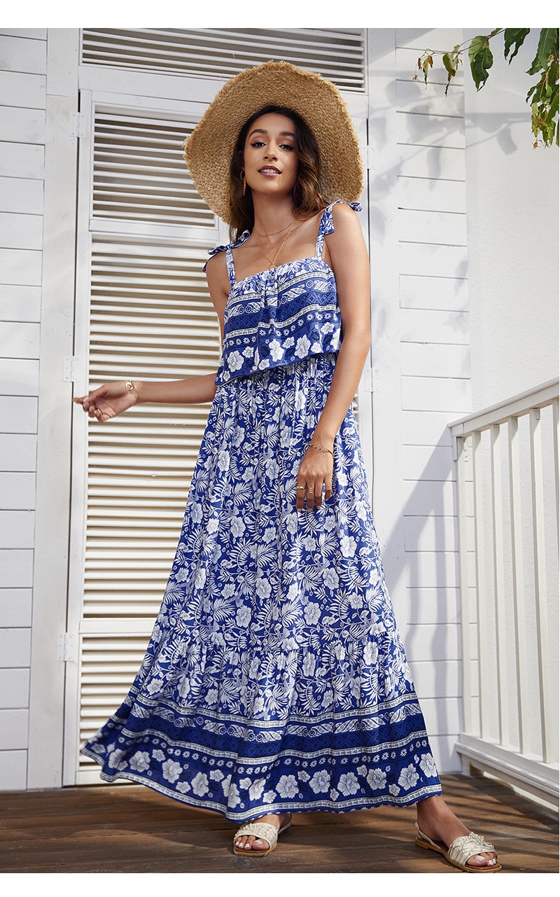 فستان نسائي بوهيمي بدون أكمام وربطة عنق مربعة وأشرطة كتف بخصر مطاطي فستان بوهيمي تنورة مطبوعة فستان شاطئ