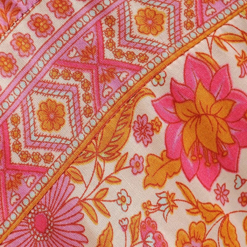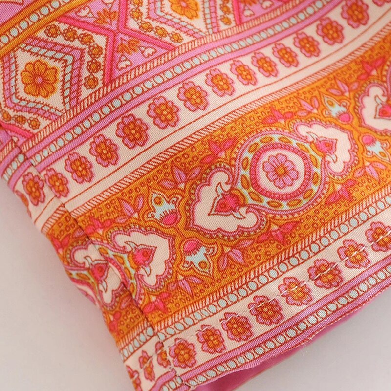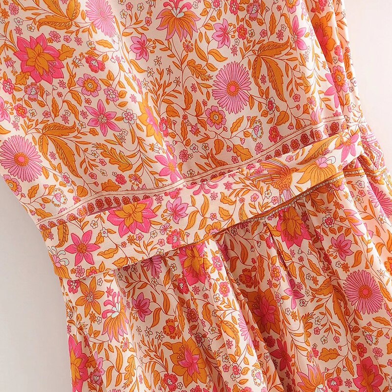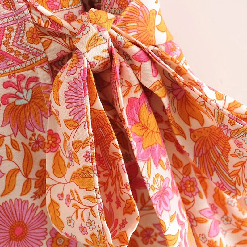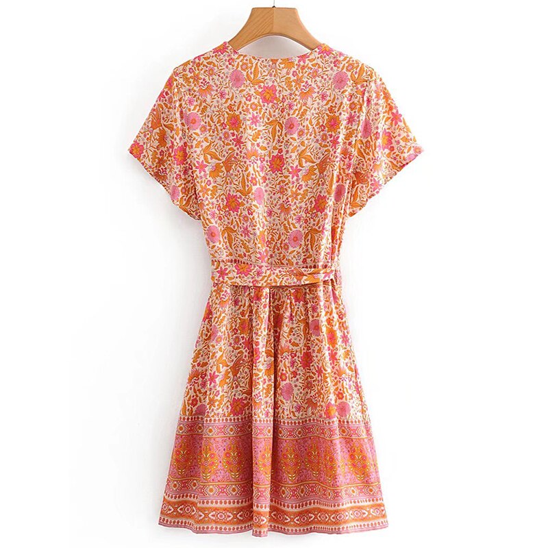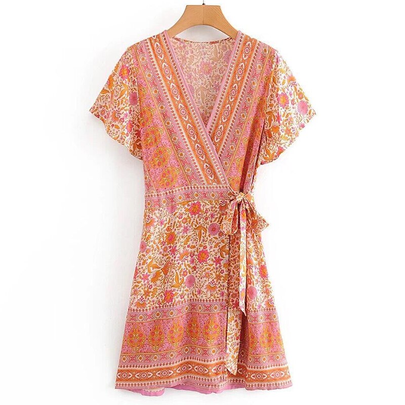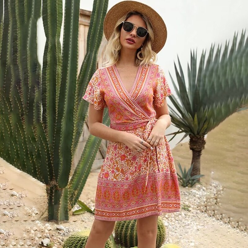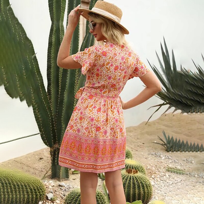 فستان نسائي بوهو قصير مطبوع عليه زهور فستان غير رسمي على شكل حرف V بأكمام قصيرة لحفلات الشاطئ فستان نسائي مكشكش ملفوف فيستيدوس