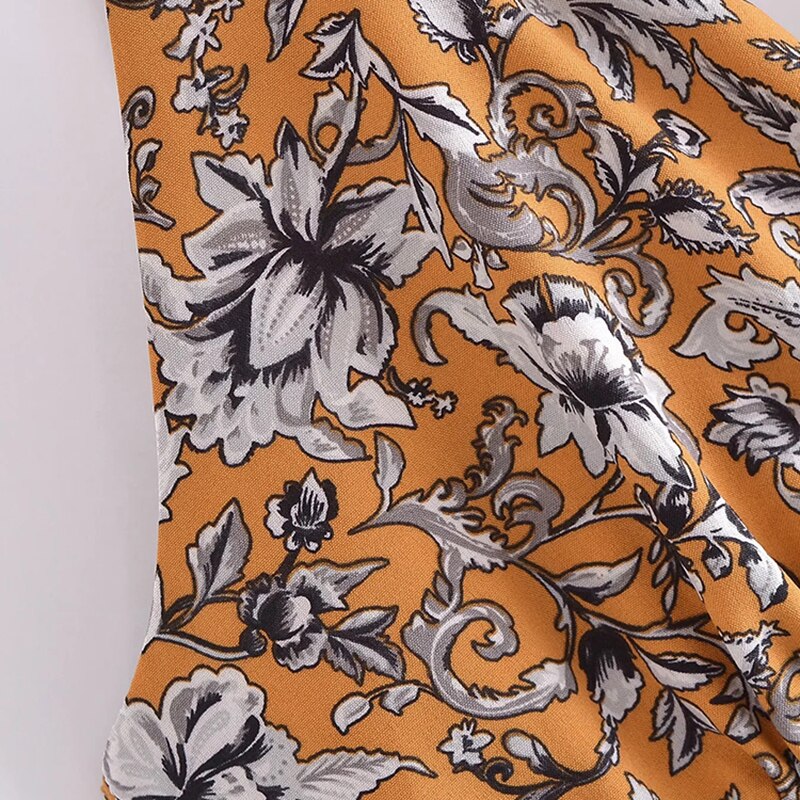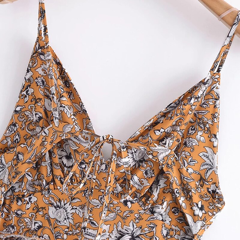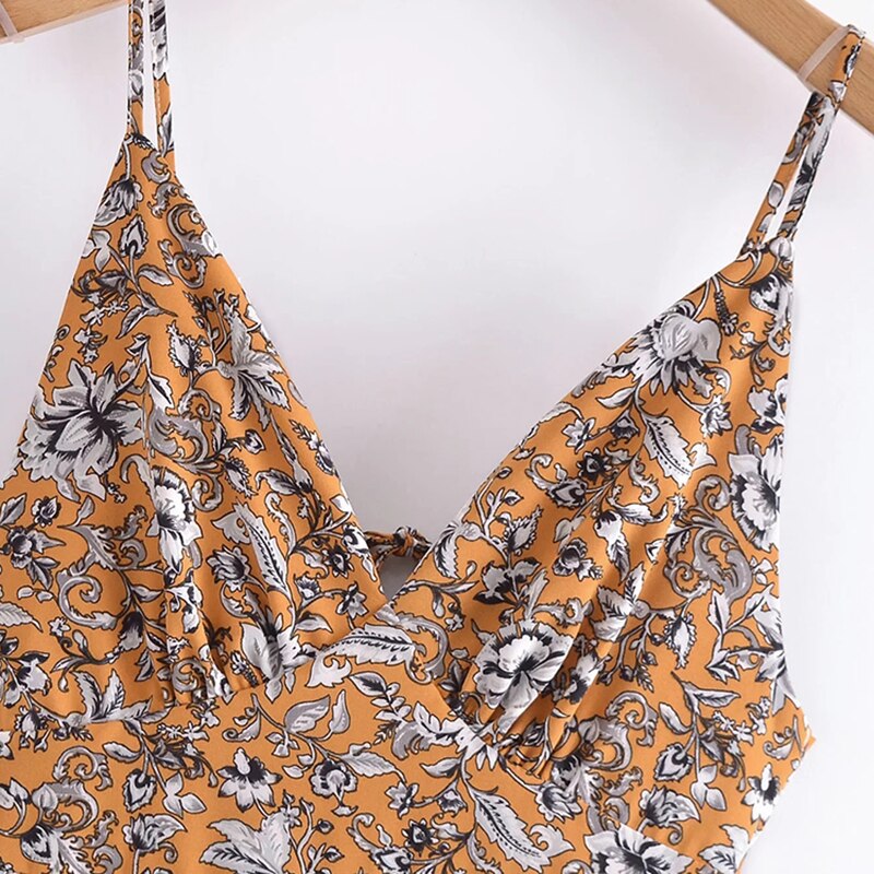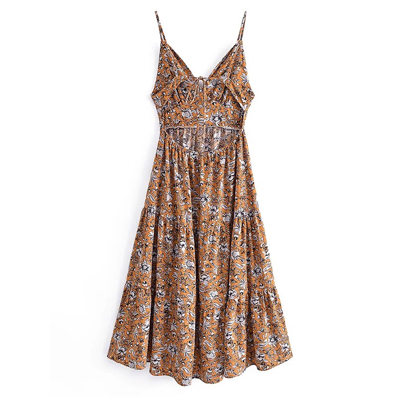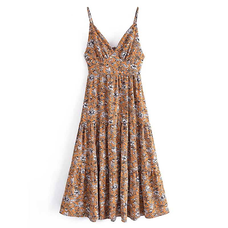 فستان نسائي بوهو ستايل مطبوع عليه زهور أنيق بياقة على شكل V بدون أكمام فستان حفلات بدون ظهر للسيدات فستان بحزام سباغيتي غير رسمي