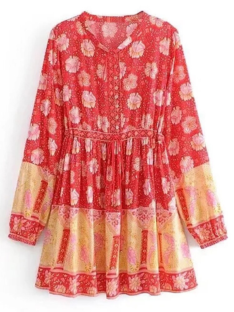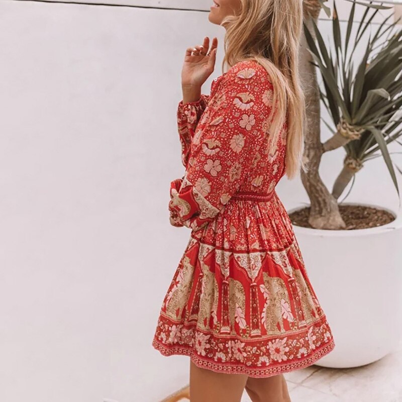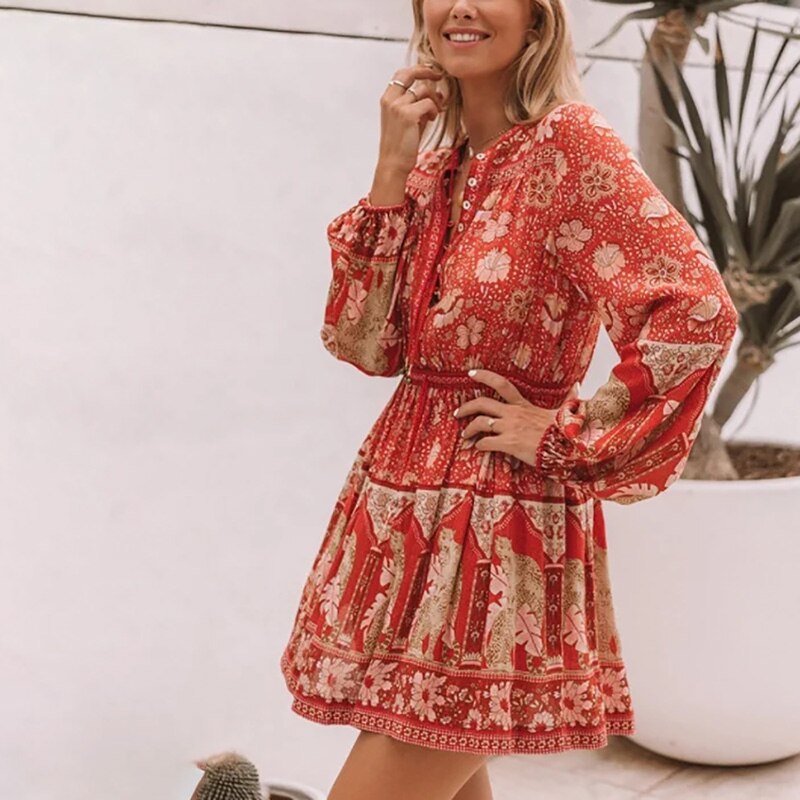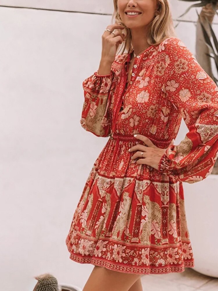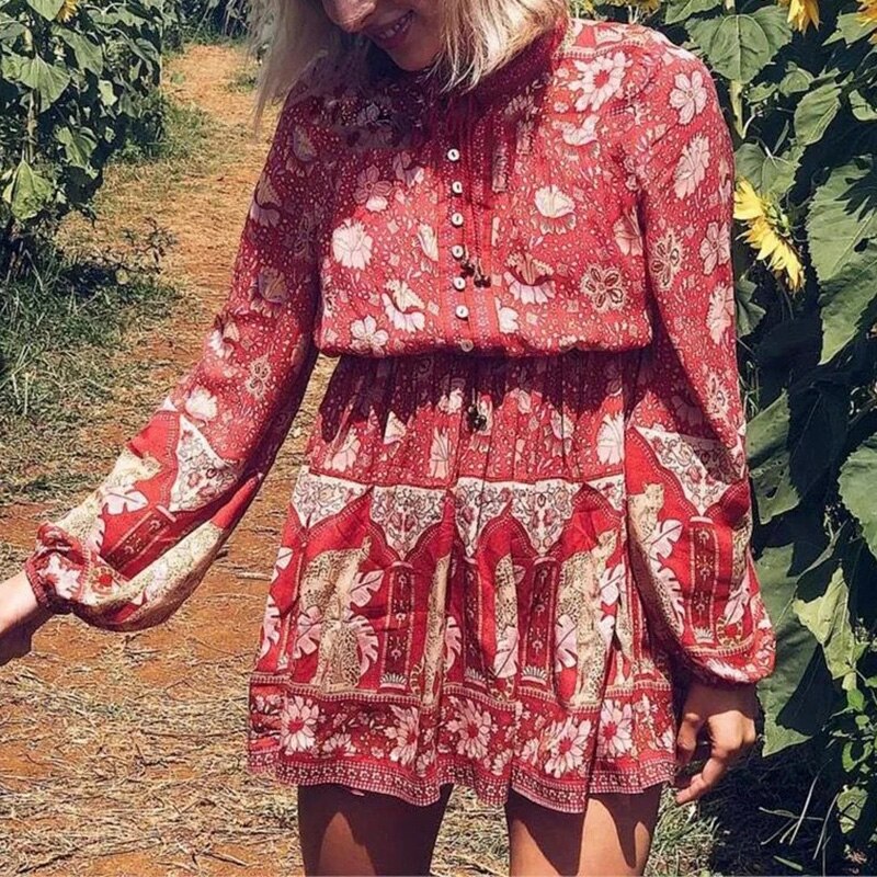 فستان نسائي قصير بنمط بوهو مطبوع عليه زهور فستان كاجوال برقبة دائرية وأكمام طويلة فستان على شكل حرف A للسيدات بأزرار للحفلات