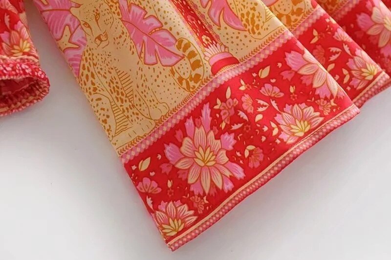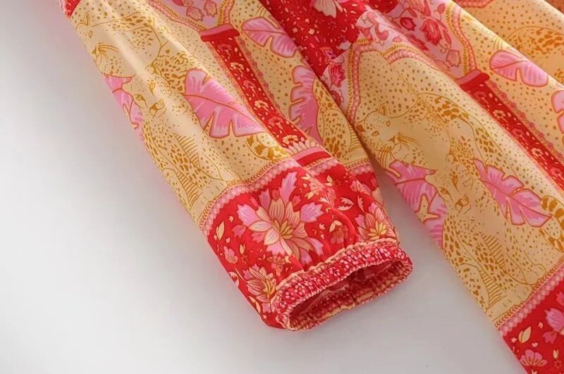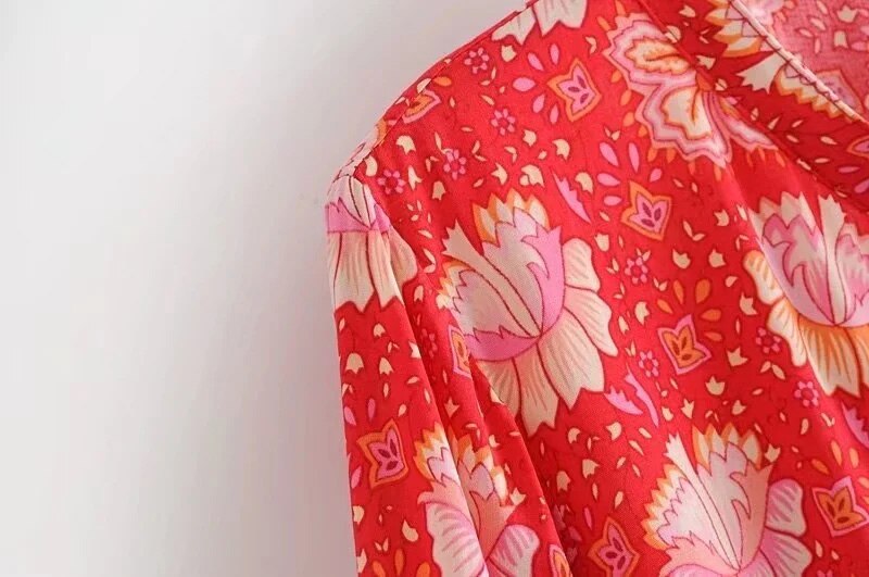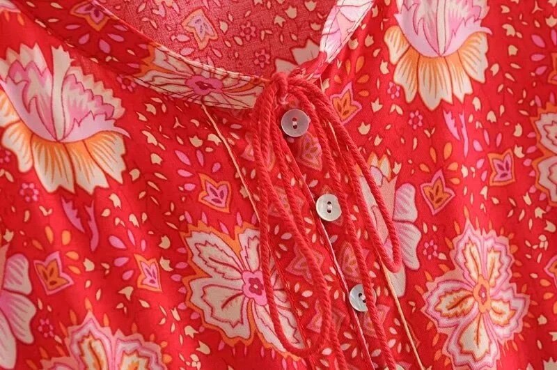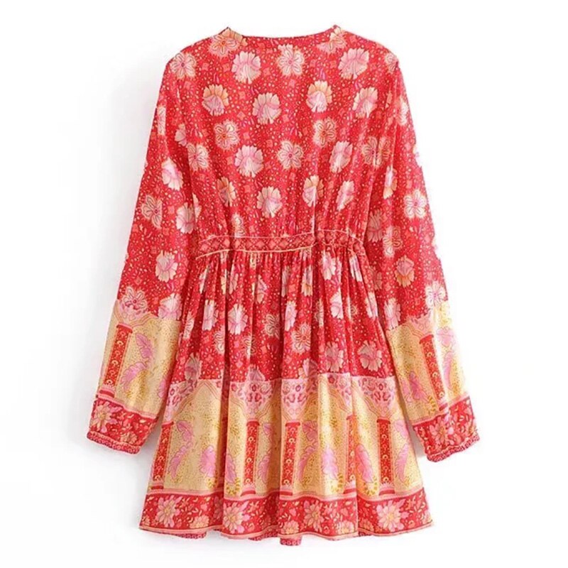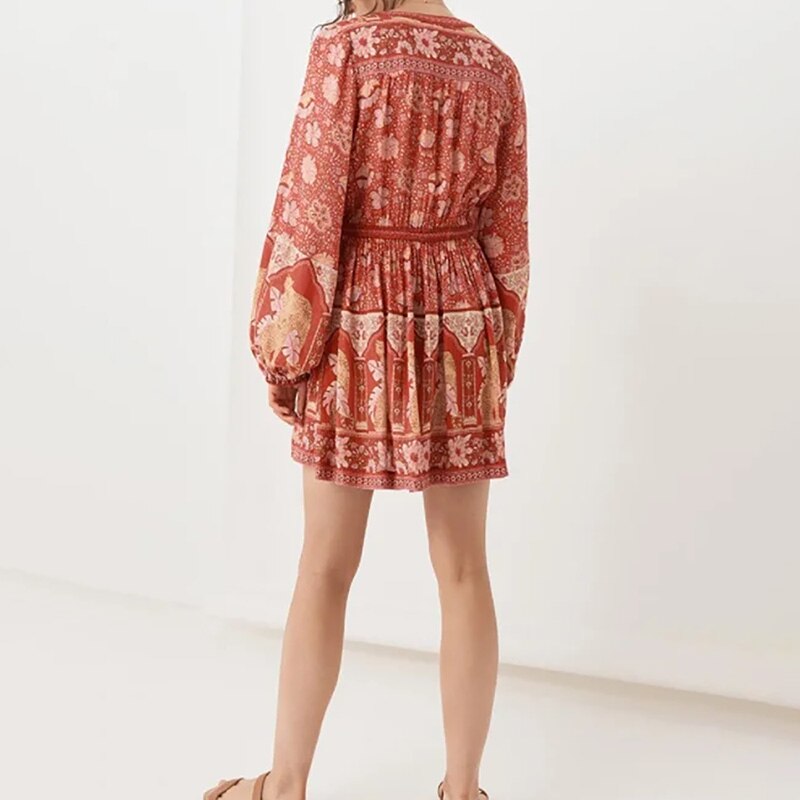 فستان نسائي قصير بنمط بوهو مطبوع عليه زهور فستان كاجوال برقبة دائرية وأكمام طويلة فستان على شكل حرف A للسيدات بأزرار للحفلات
