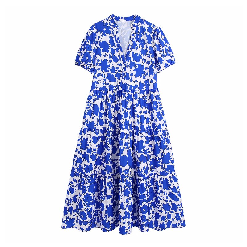 المرأة الصيف بوهو نمط الأزهار المطبوعة فساتين متوسطة الطول الخامس الرقبة نفخة قصيرة الأكمام فساتين الإناث أنيقة ألف خط فستان الشمس