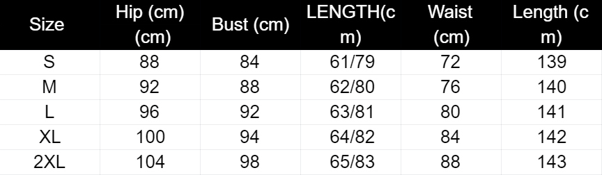 | Product Size | Bust/Chest(cm) | Skirt length(cm) |