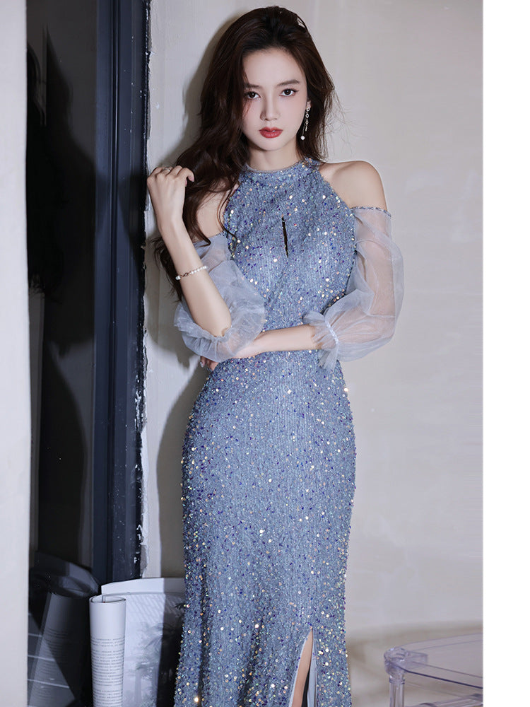 Best-selling new annual meeting evening dress skirt female blue long hanging neck host light luxury niche celebrity banquet temperament sequins