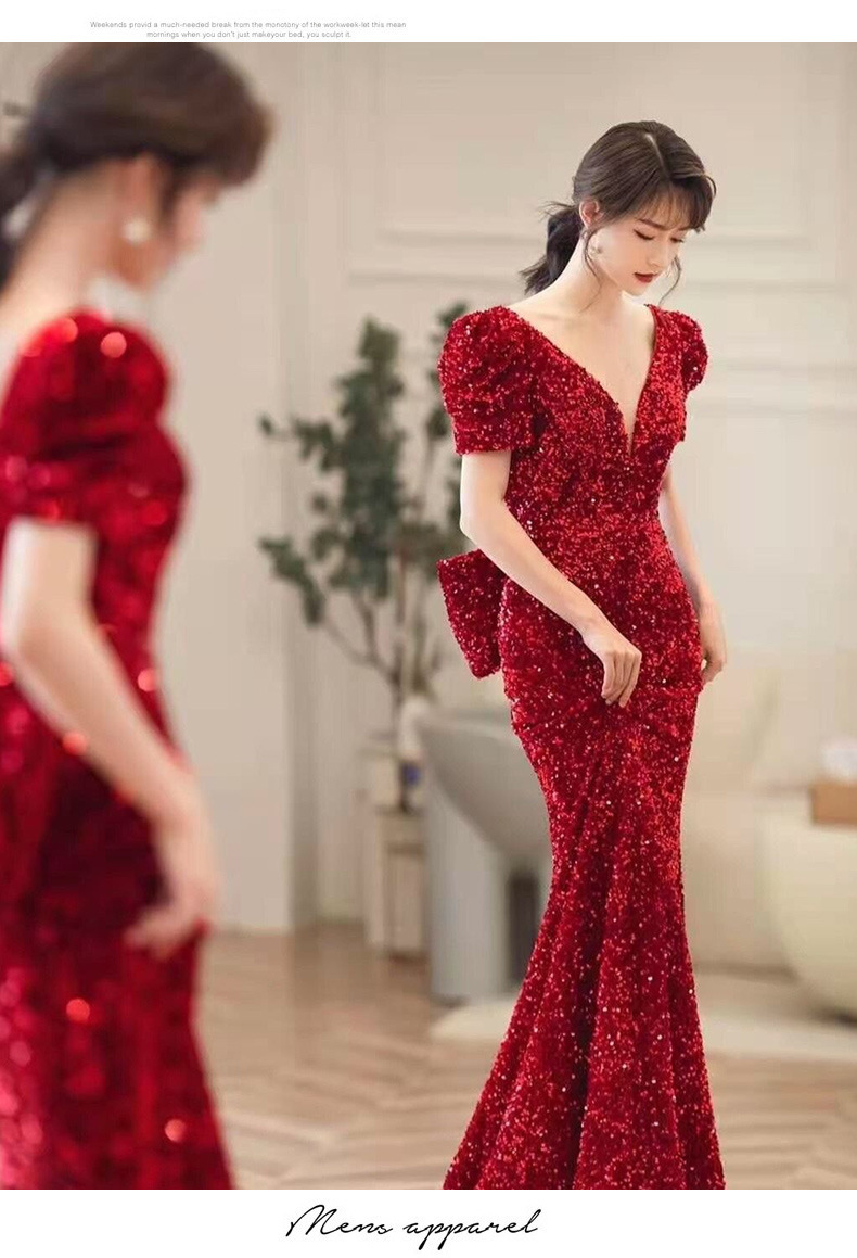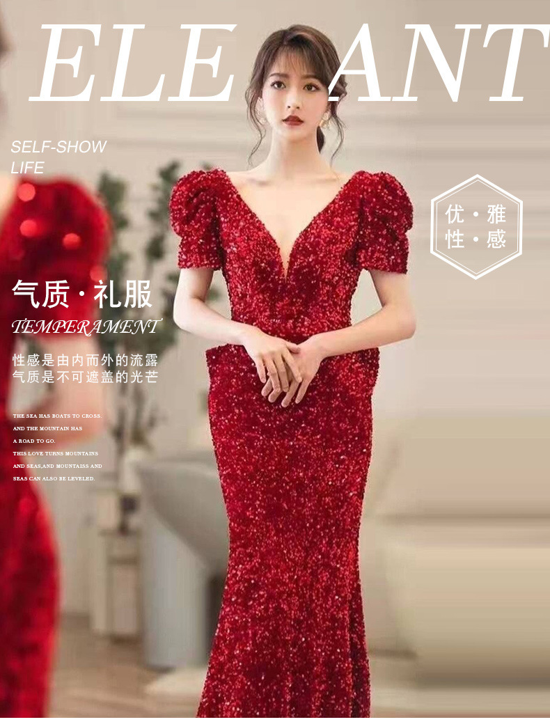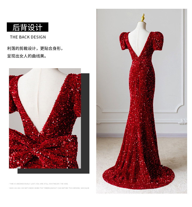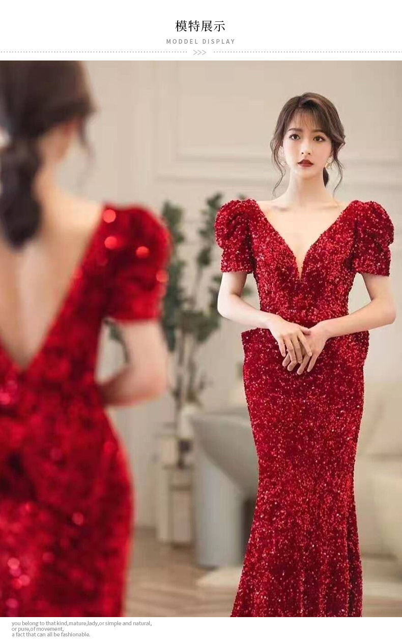 Best-selling new toast dress bride trailing 2023 new winter red fishtail leaky back sequins banquet host evening dress female
