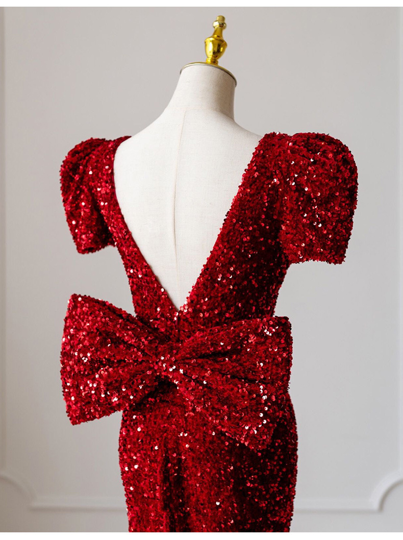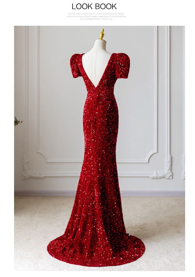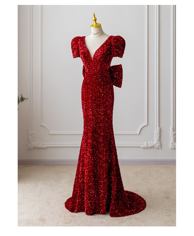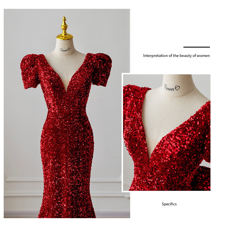 Best-selling new toast dress bride trailing 2023 new winter red fishtail leaky back sequins banquet host evening dress female
