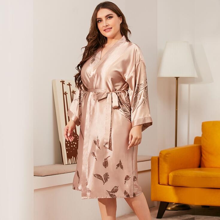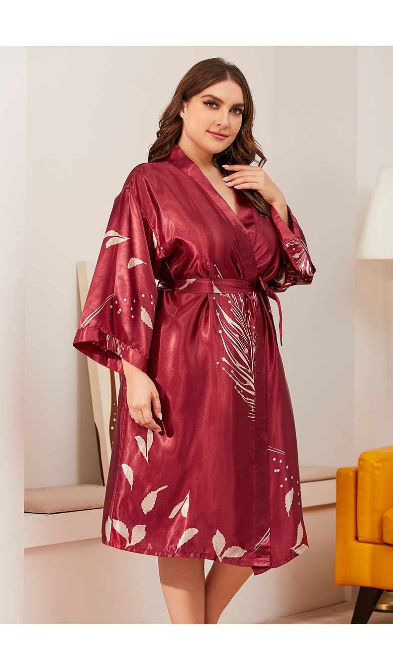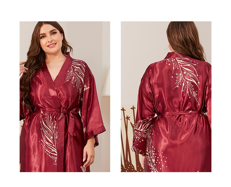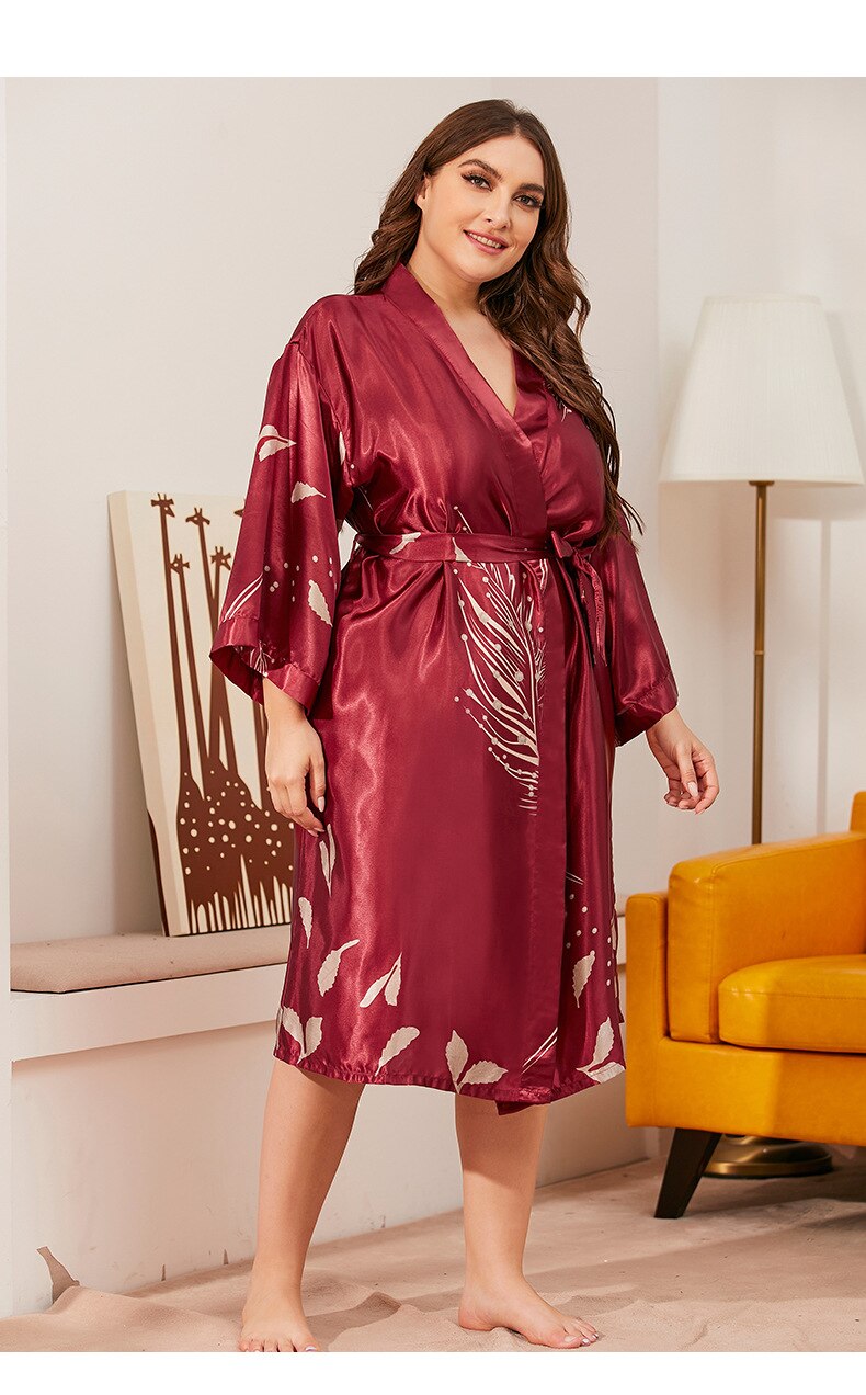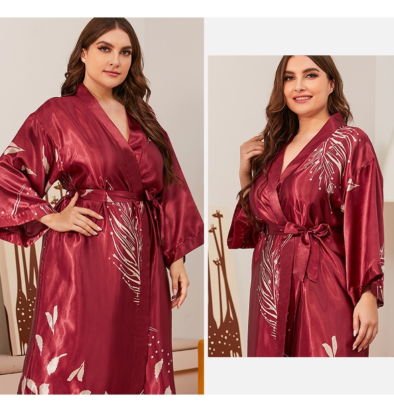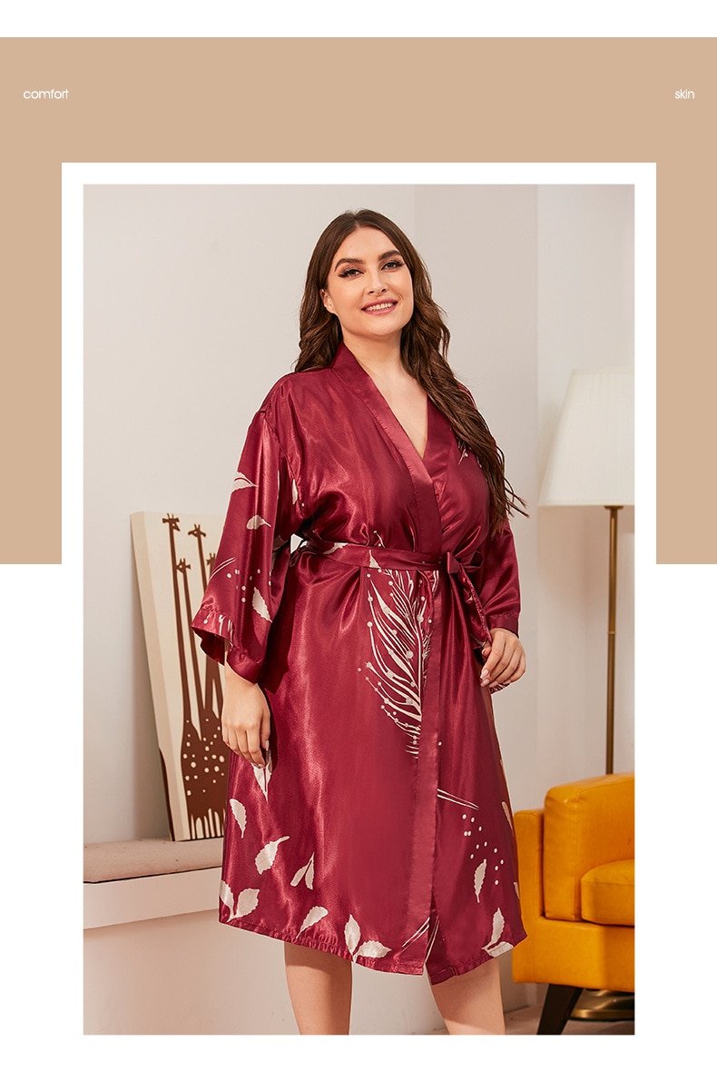 Burgundy Women Full Sleeve Summer Kimono Robe Bathrobe Satin Print Leaf Nightdress Plus Size XL-3XL Loose Home Dress Sleepwear