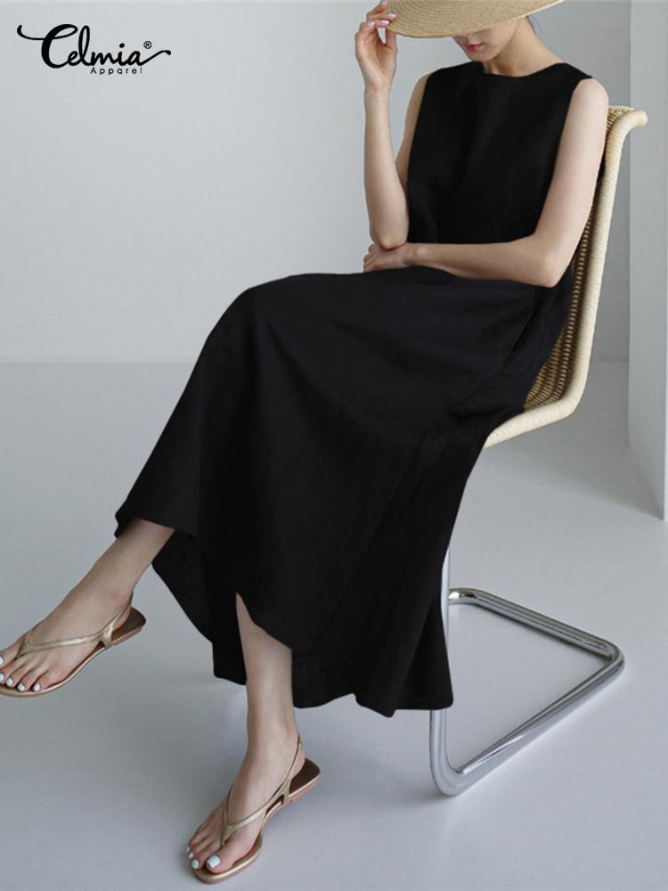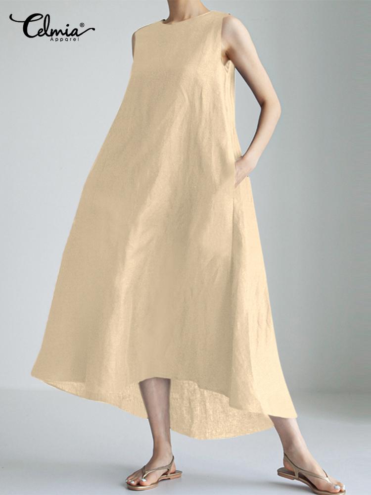 -Features:Japanese and Korean Casual Round Neck Sleeveless Pocket A Long Dress