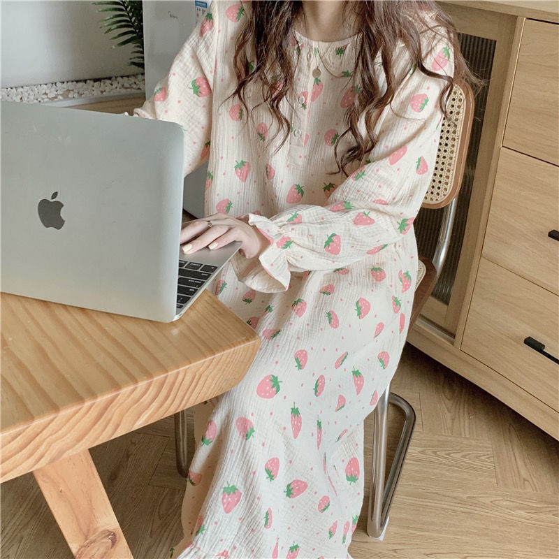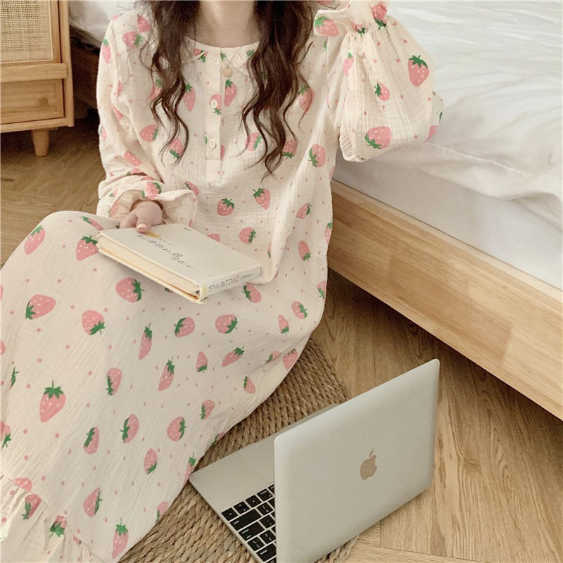 Cute Long Sleeve Nightgowns Women Sleepshirts Ruffle Tender Strawberry Print A-line Nightdress Girls Midi Autumn Sweet Sleepwear