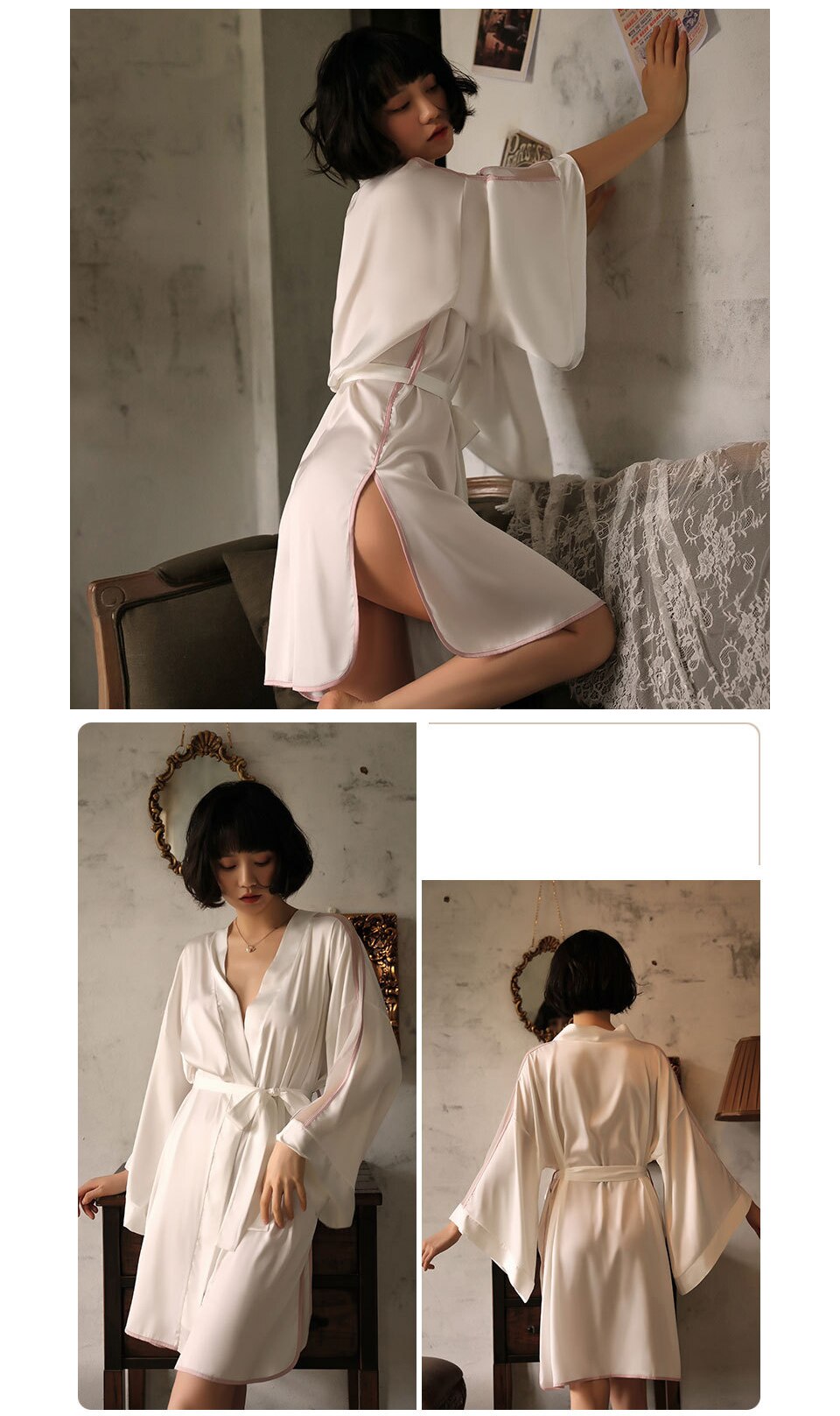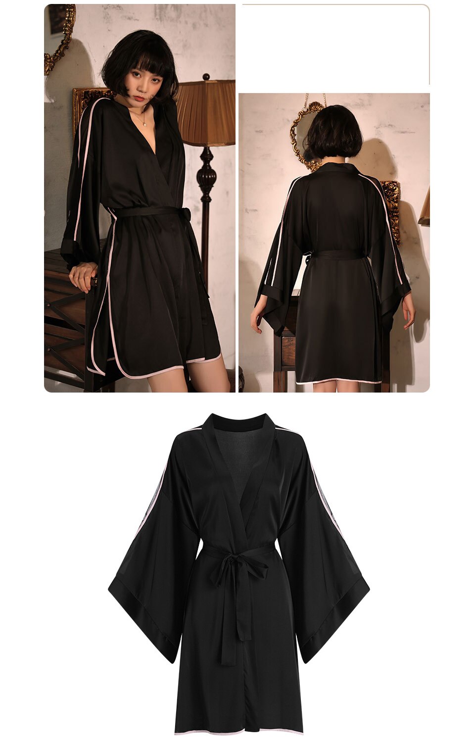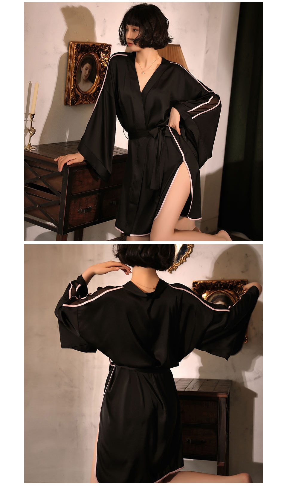 Elastic satin cross bandage long sleeve women's bathrobe line segmentation sexy slim black gown pajamas deep V women's