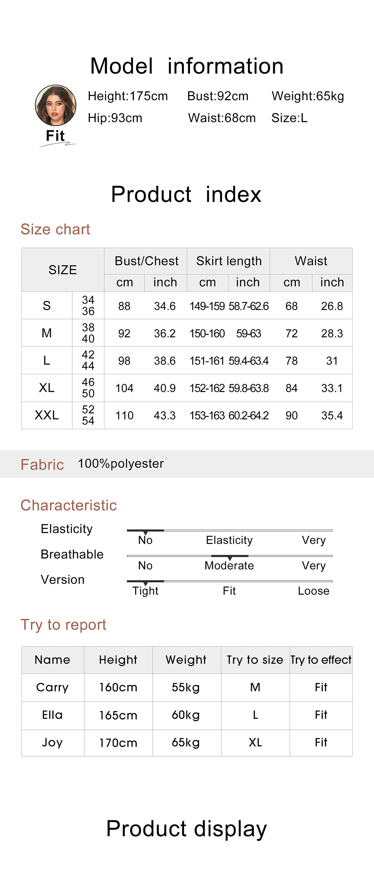 | Product Size | Bust/Chest(cm) | Skirt length(cm) | Waist(cm) |