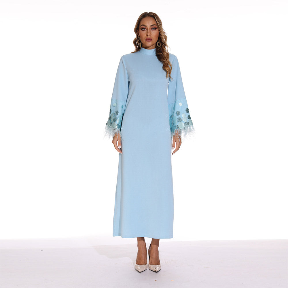 Elegant solid color women's long dress with round neckline, embellished with sparkling sequins and featuring feathered sleeves