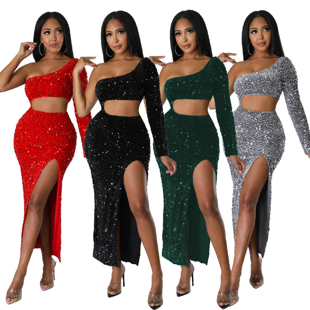 European and American dress bag hip mid-length skirt slanted collar hollowed out long-sleeved high slit sequined sexy dress for women
