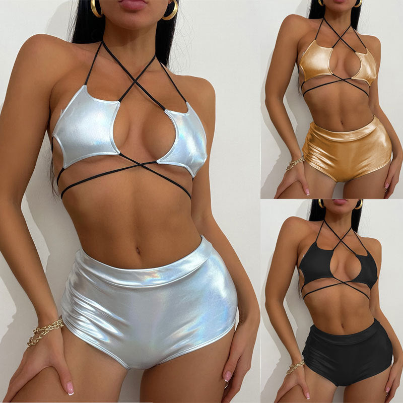 European and American foreign trade new bikini split swimsuit star sequins silver hanging neck tie bikini