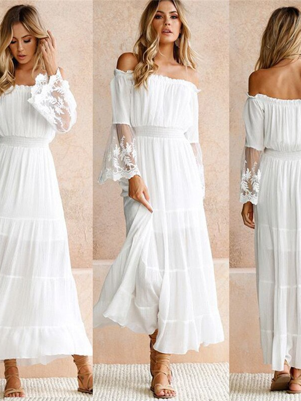 Female Strapless Long Sleeve Sundress Women's White Beach Dress Summer Loose Sexy Off Shoulder Lace Boho Maxi Dress Feme
