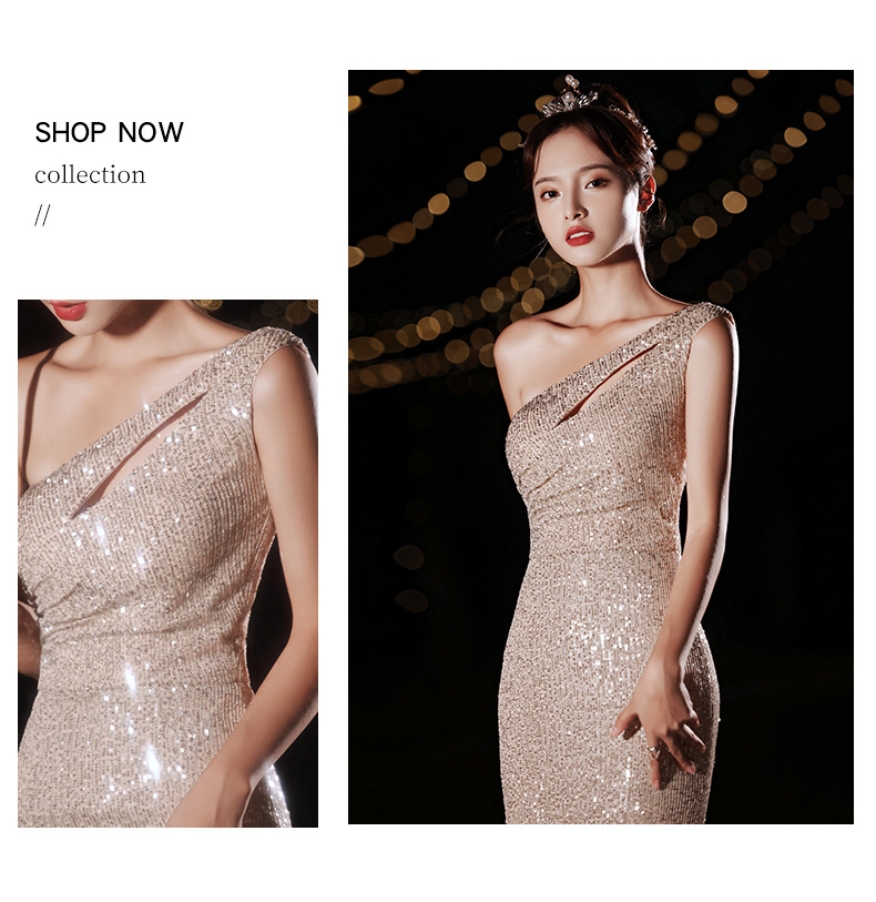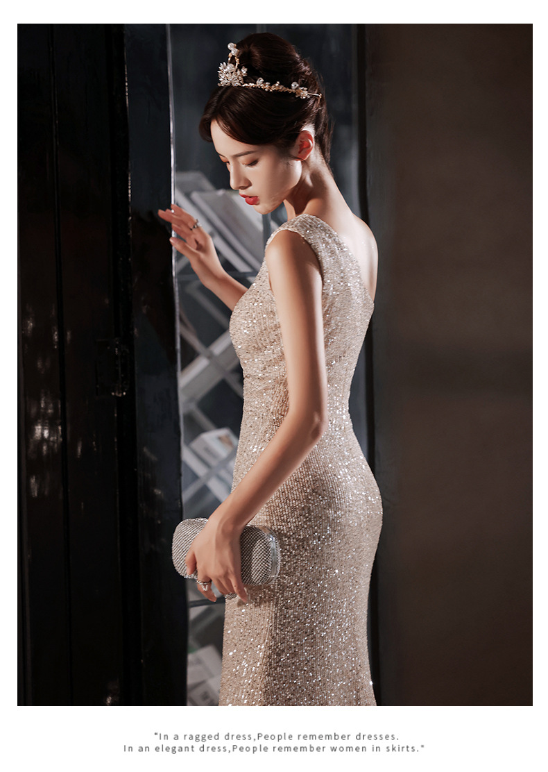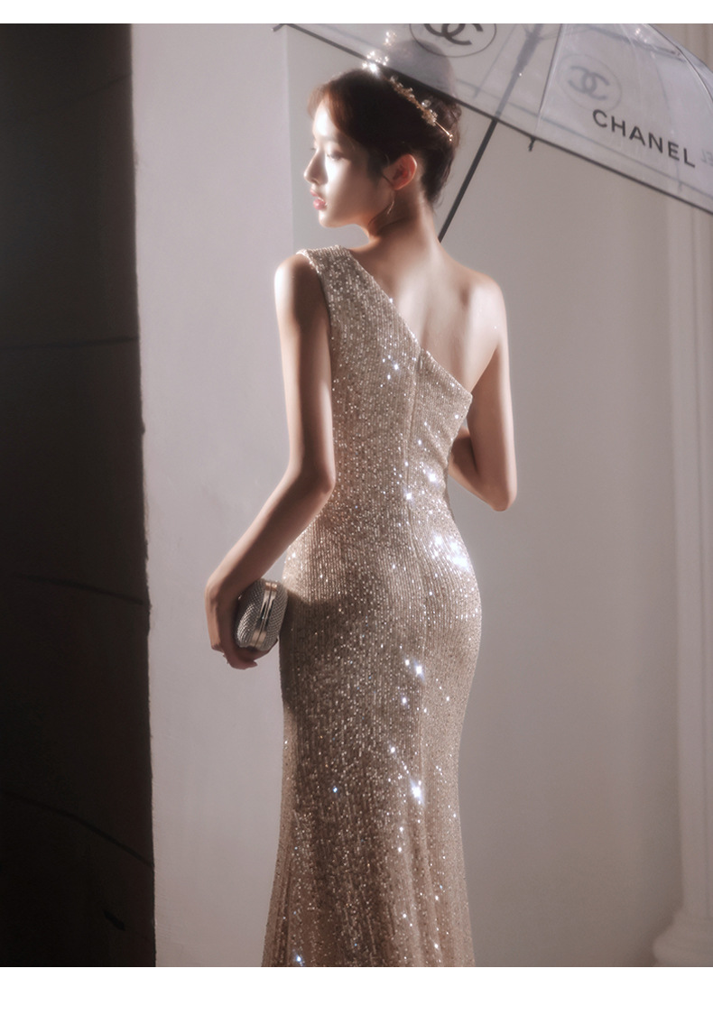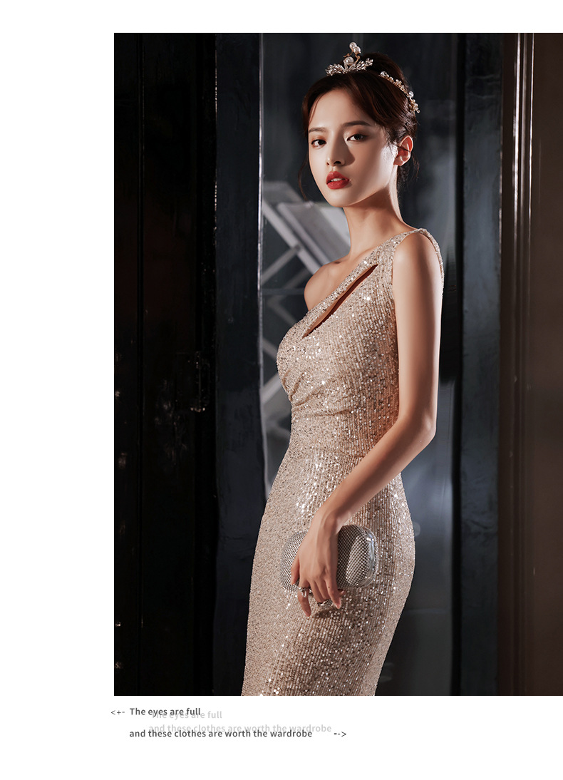 Fishtail Evening Dress Women's Autumn Autumn Long One-shoulder Sexy Sequin Dress Engagement Banquet Temperament Host Dress