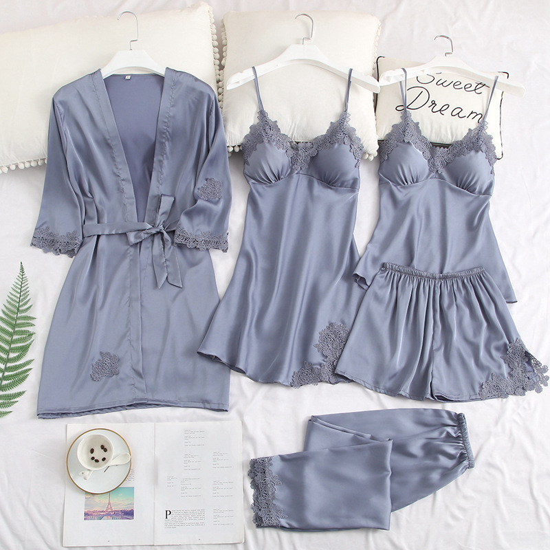 Five-piece pajamas women's summer thin ice silk suspender nightdress nightgown set