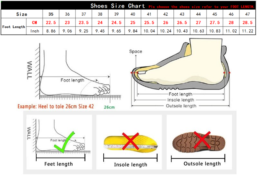 Pls choose the shoes size refer to your FOOT LENGTH.
